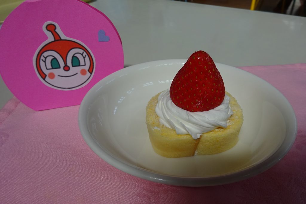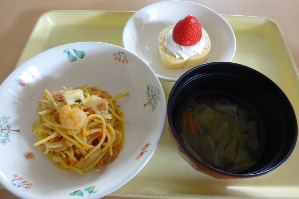 5/27(火)の誕生会は給食で「シーフードパスタ・野菜スープ・セレクトゼリー」おやつは「ストロベリーケーキ」を作りました