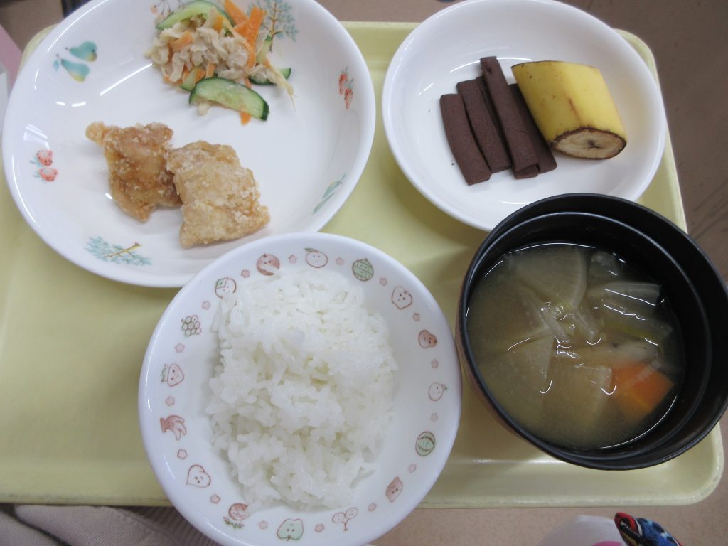 5月のかみかみメニューは「鶏肉の竜田揚げ・切干大根とさきいかのサラダ・根菜汁・バナナ」おやつは「かみかみクッキー」を作りました![]()
