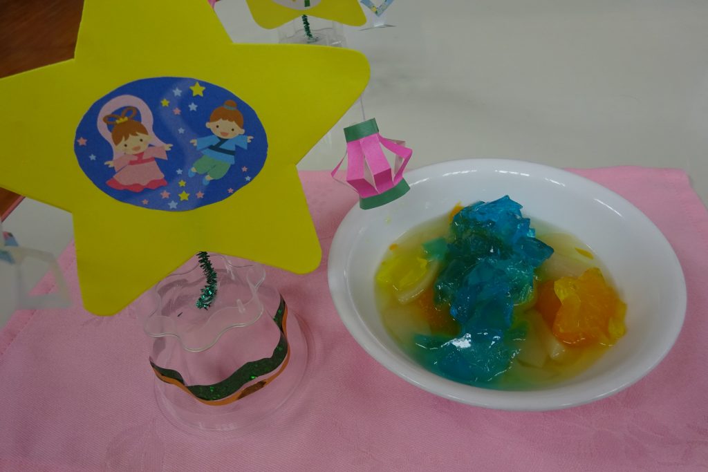 7月7日の七夕誕生会は給食で「七夕そうめん」、おやつは「天の川キラキラフルーツポンチ」を作りました