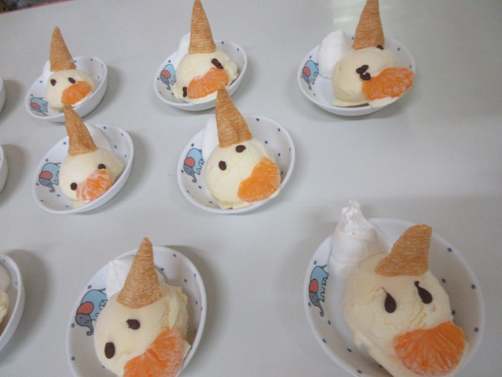 1/16(金)の誕生会で給食は「麻婆ラーメン」おやつは「ウマケーキ」を作りました