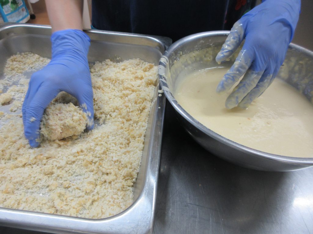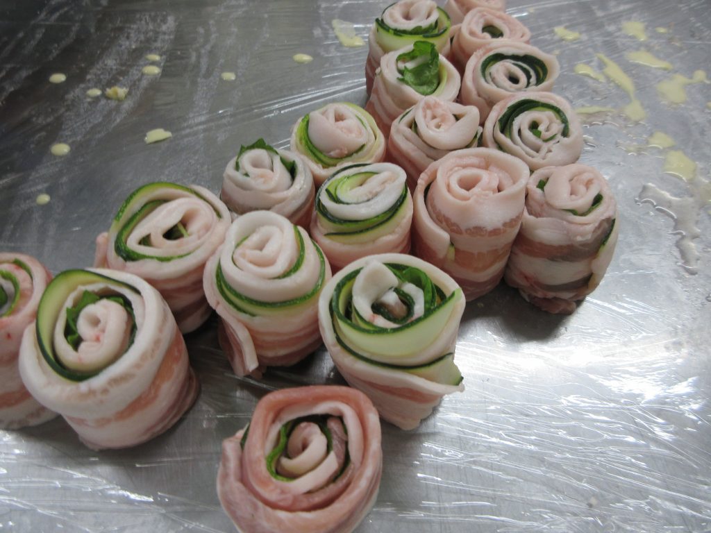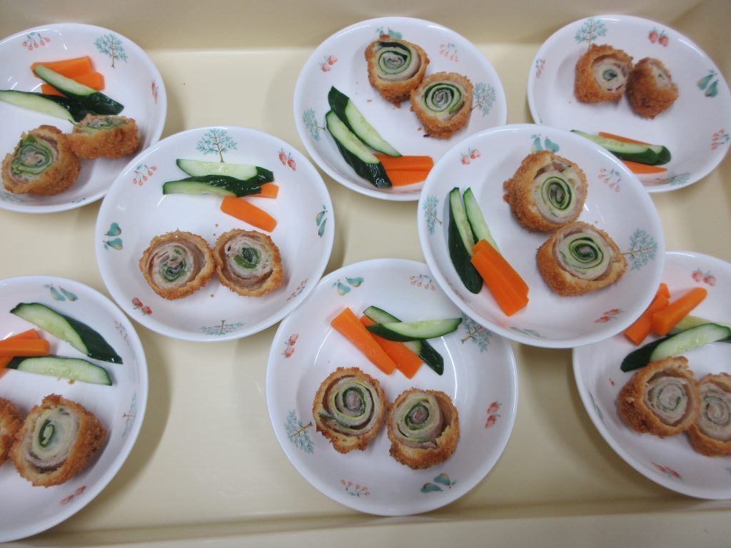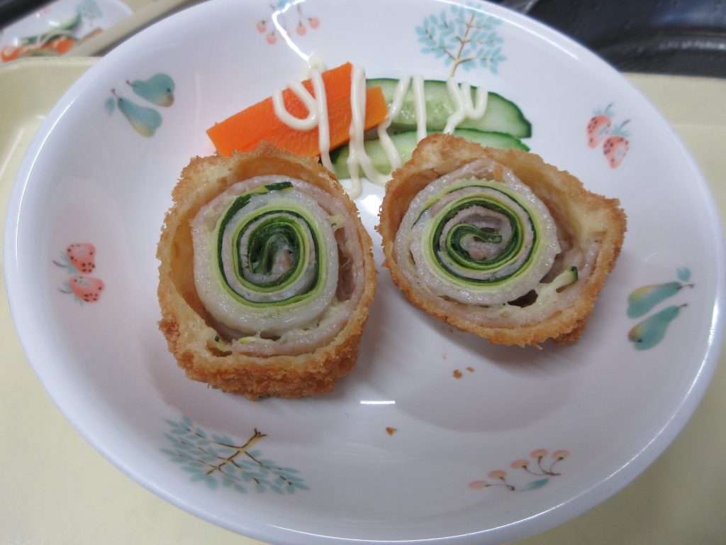 ズッキーニのロールカツは、豚肉の上にスライスしたズッキーニと保育園で収穫した大葉をのせて巻き、衣を付け油で揚げました