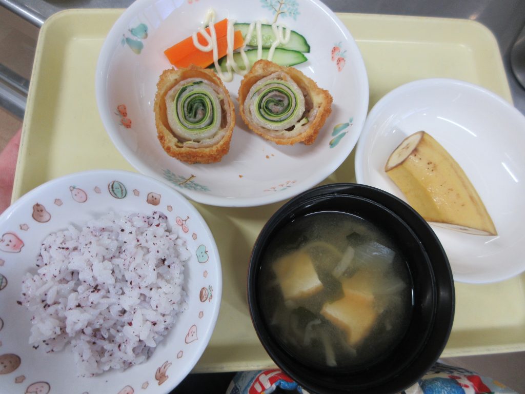 8月のかみかみメニューは「ズッキーニのロールカツ・スティック野菜・みそ汁・バナナ」、おやつは「カレーチーズトースト」を作りました
