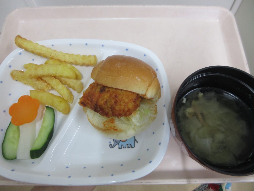 給食は『浜保バーガー・ポテトフライ・スティック野菜・スープ・ゼリー』、おやつは『お月見うさぎ』を作りました