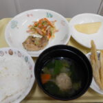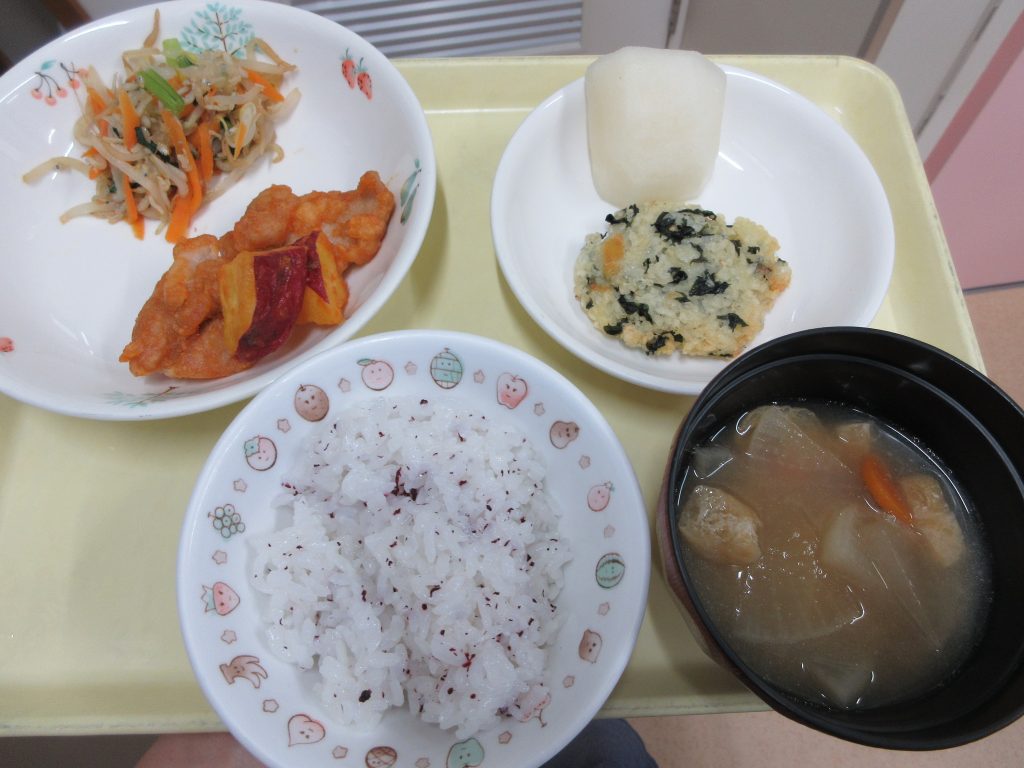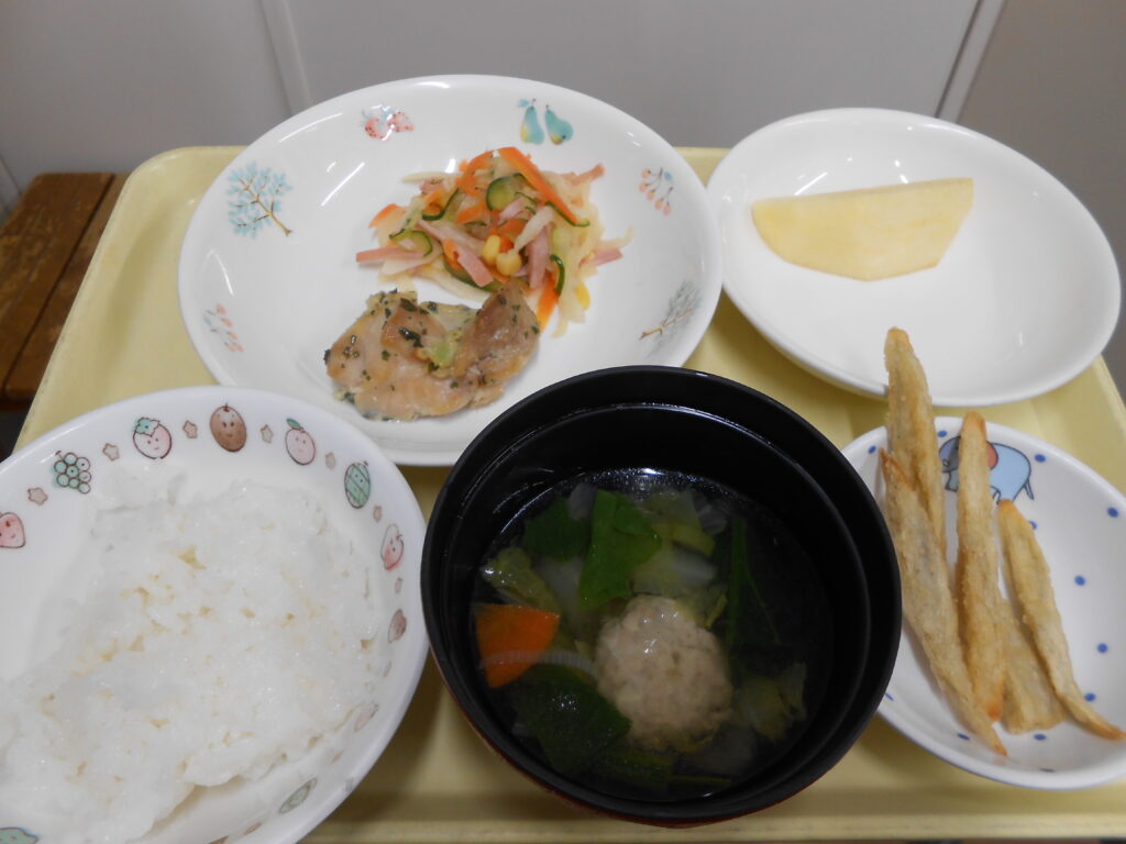 1/23(金)のかみかみメニューでは「ガーリックチキン・冬野菜サラダ・白菜スープ・りんご」おやつは「フライドごぼう」を作りました