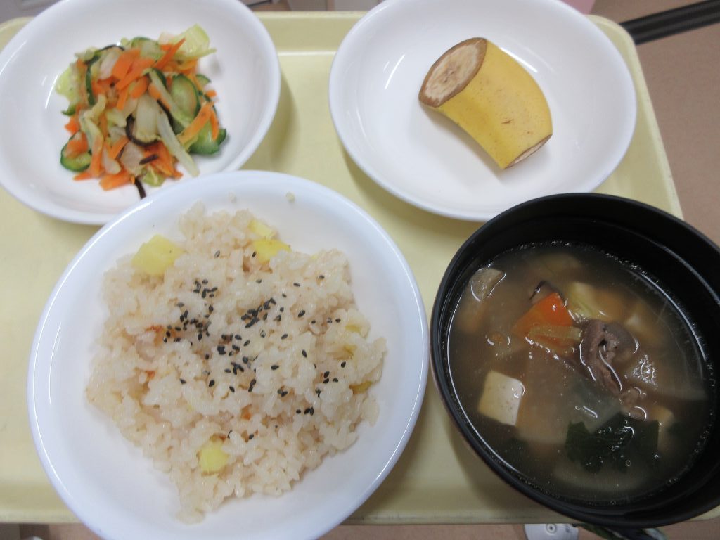 11/5(水)の世代間交流では「さつまいもご飯・浅漬け・沢煮椀・バナナ」を作りました