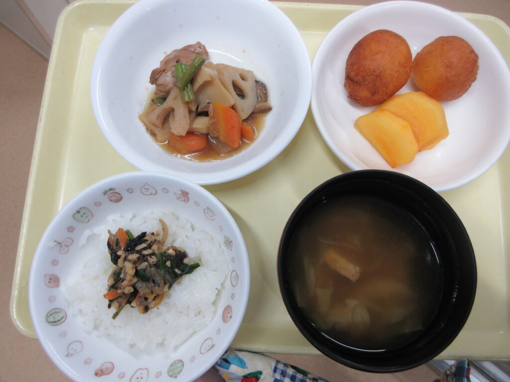 11/21(金)のかみかみメニューは給食で「筑前煮・ハリハリ納豆・みそ汁・柿」おやつは「いもいもドーナツ」を作りました