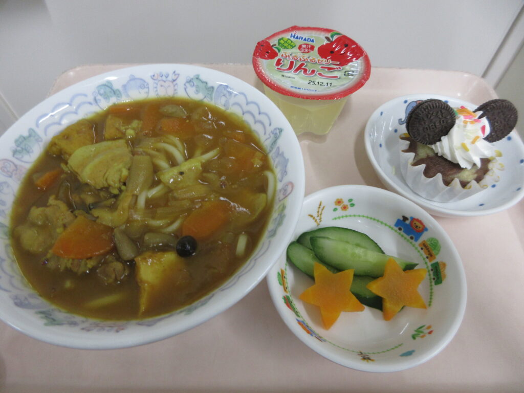 11/28(金)の誕生会では、給食で「どすこいカレーうどん・スティック野菜・セレクトゼリー」おやつは「ミッキーカップケーキ」を作りました