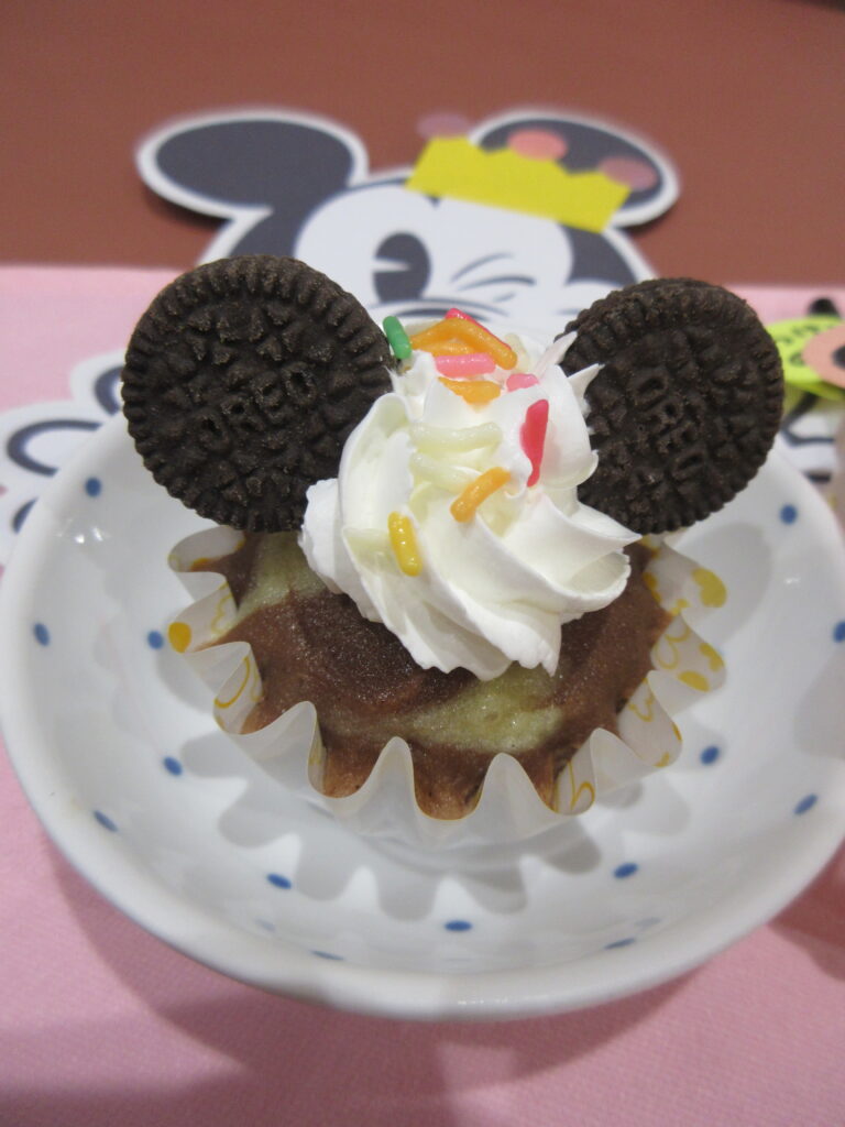 ミッキーカップケーキはココアとプレーン生地を、マーブル模様にして蒸しパンを作りました