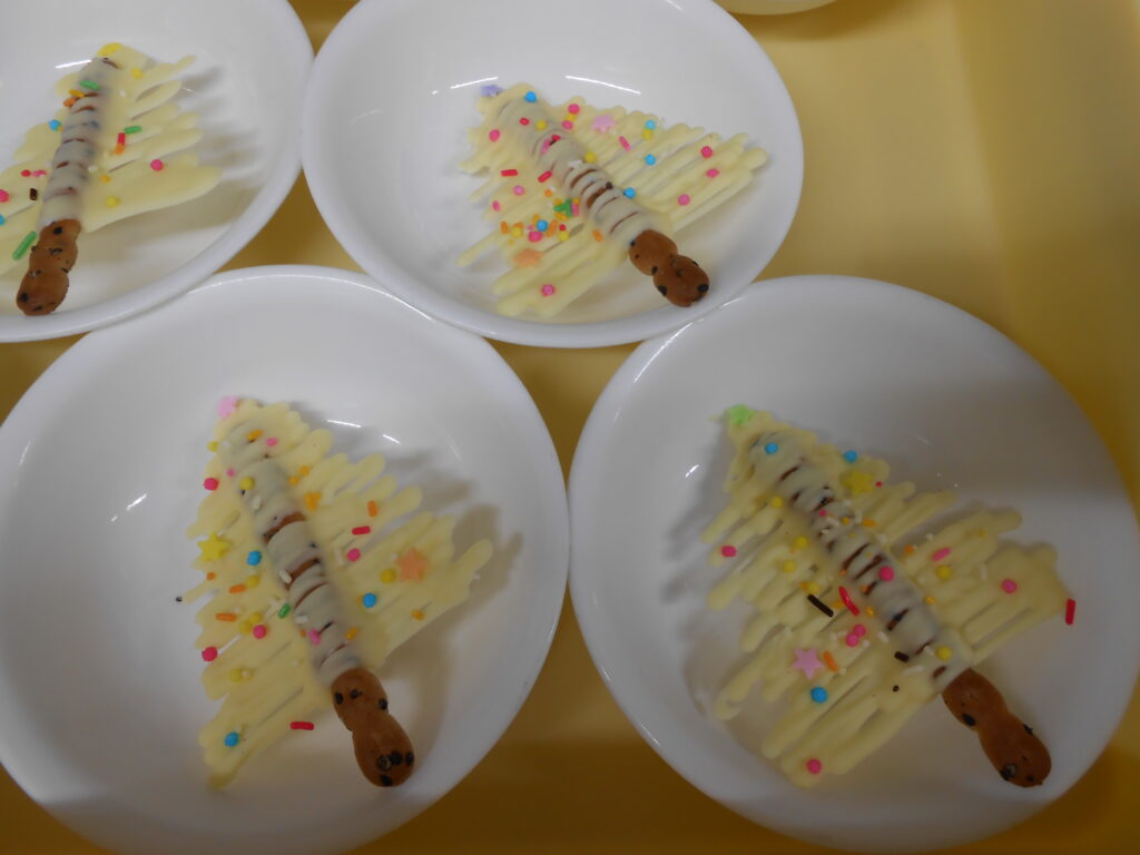 ホワイトクリスマスはお菓子のアスパラガスに、ホワイトチョコでツリーに見立て、チョコスプレーなどで飾り付けをしました