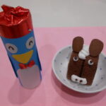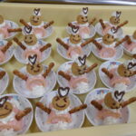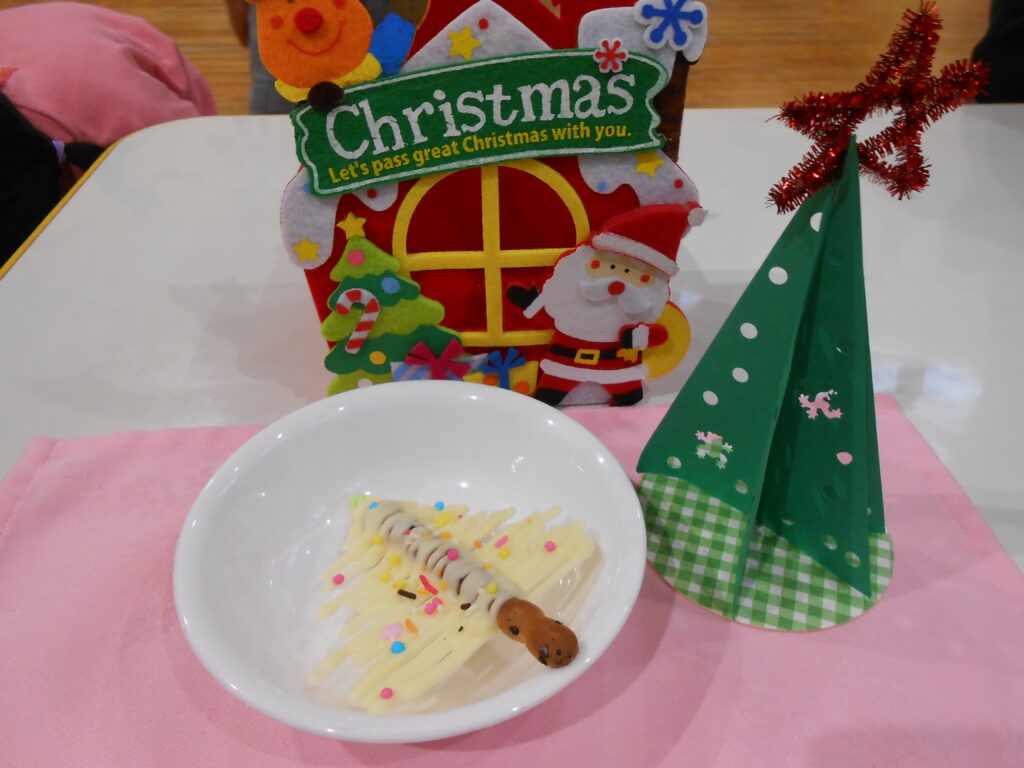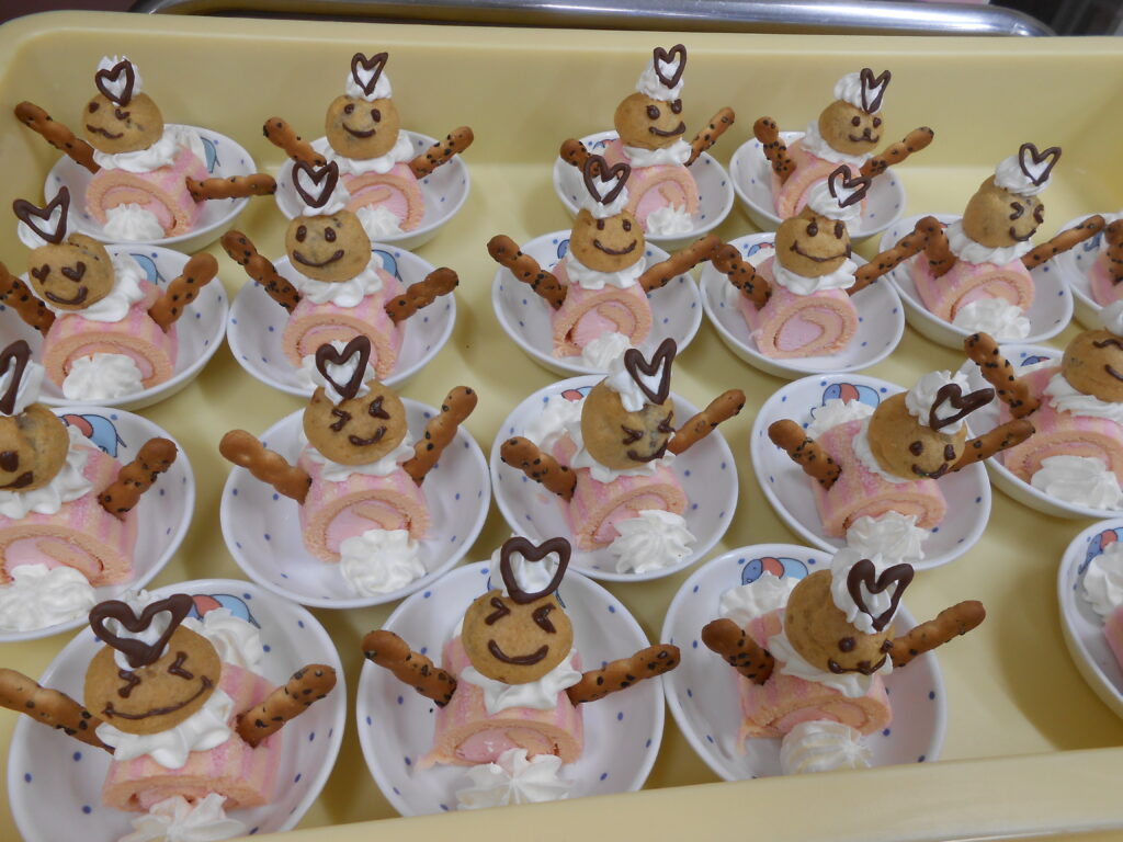 12/25(木)は給食で「ロールパン・ブラウンシチュー・トナカイハンバーグ・茹で野菜・麦茶・ゼリー」おやつは「ホワイトクリスマス」を作りました
