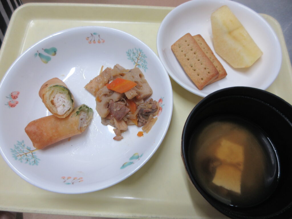 12/24(水)は給食で「ささみ肉の春巻き・れんこんきんぴら・みそ汁・りんご」おやつは「かみかみサブレ」を作りました