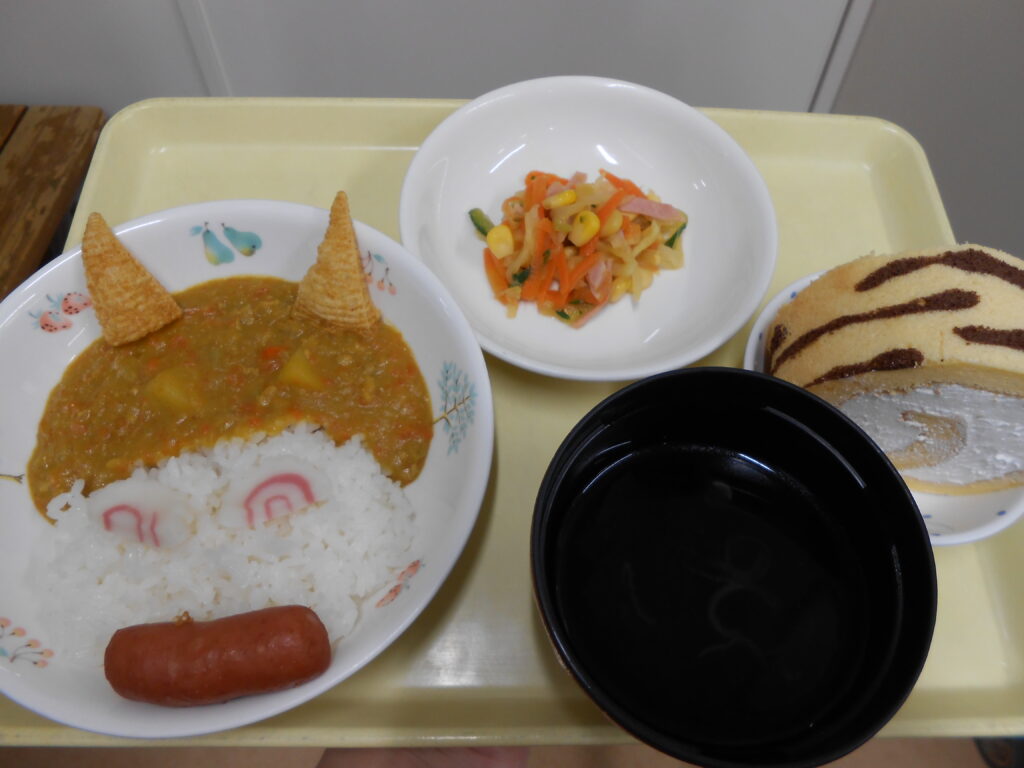 2月3日(火)の給食は『おにのドライカレー・大根サラダ・わかめスープ・セレクトゼリー』おやつは『おにのパンツ』を作りました