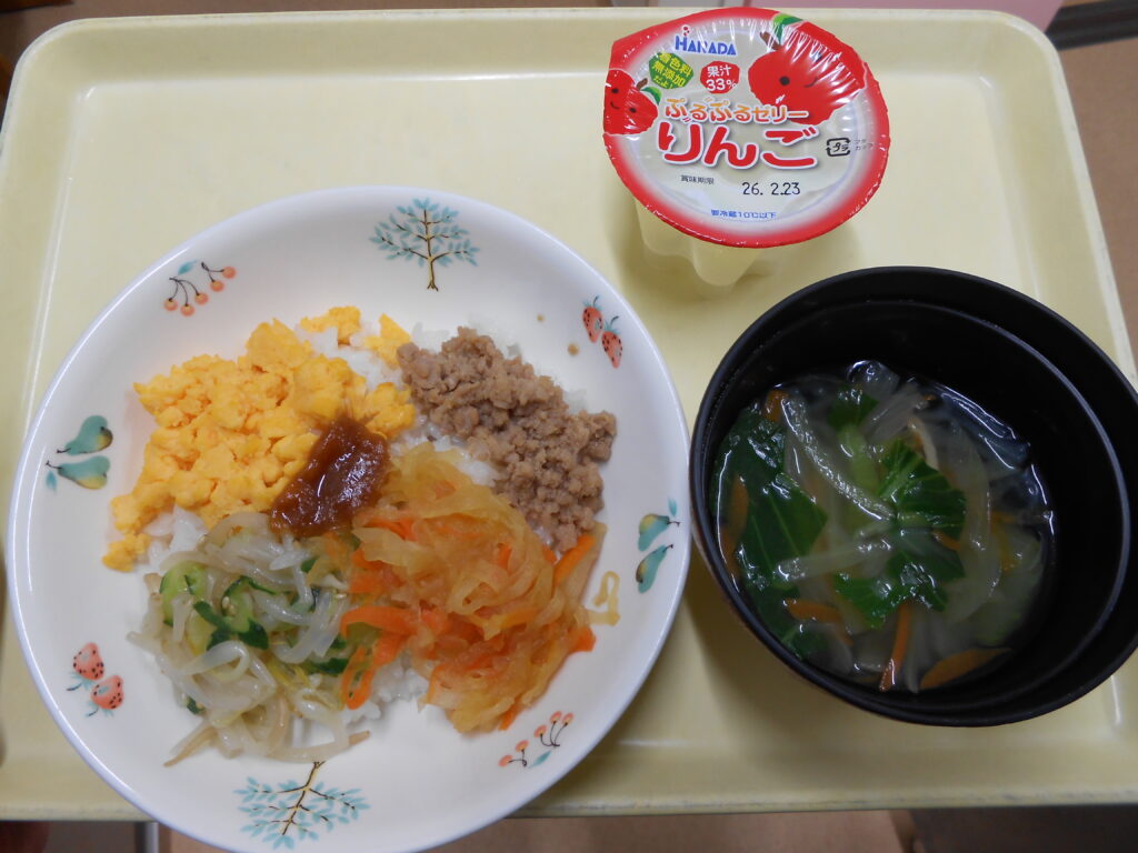 2月の誕生会の給食は「ビビンバ丼・わかめスープ・セレクトゼリー」おやつは「ハッピーゆきだるま」を作りました