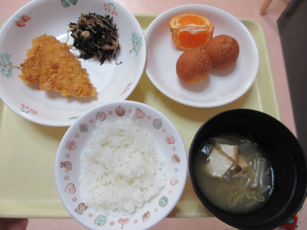 2月10日(火)のかみかみメニューでは、給食で「かみかみチキン・ひじきの炒め煮・みそ汁・ぽんかん」おやつは「おからドーナツ」を作りました