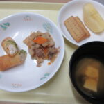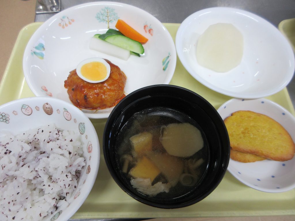 10/6(月)の給食は「お月見ハンバーグ・スティック野菜・里芋汁・梨」、おやつは「満月クッキー」を作りました