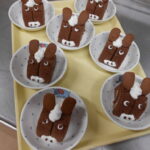 お月見うさぎは、スイートポテトの体にチョコで顔を書き、手作りクッキーで耳を作りました