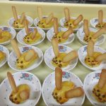 給食は『浜保バーガー・ポテトフライ・スティック野菜・スープ・ゼリー』、おやつは『お月見うさぎ』を作りました