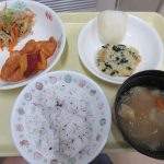 9月のかみかみメニューは『鶏肉とさつまいものオーロラソース和え・しらすサラダ・みそ汁・梨』、おやつは『かみかみせんべい』を作りました