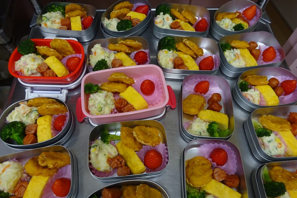 手作りの卵焼きやポテトサラダ、お花のウインナーなど