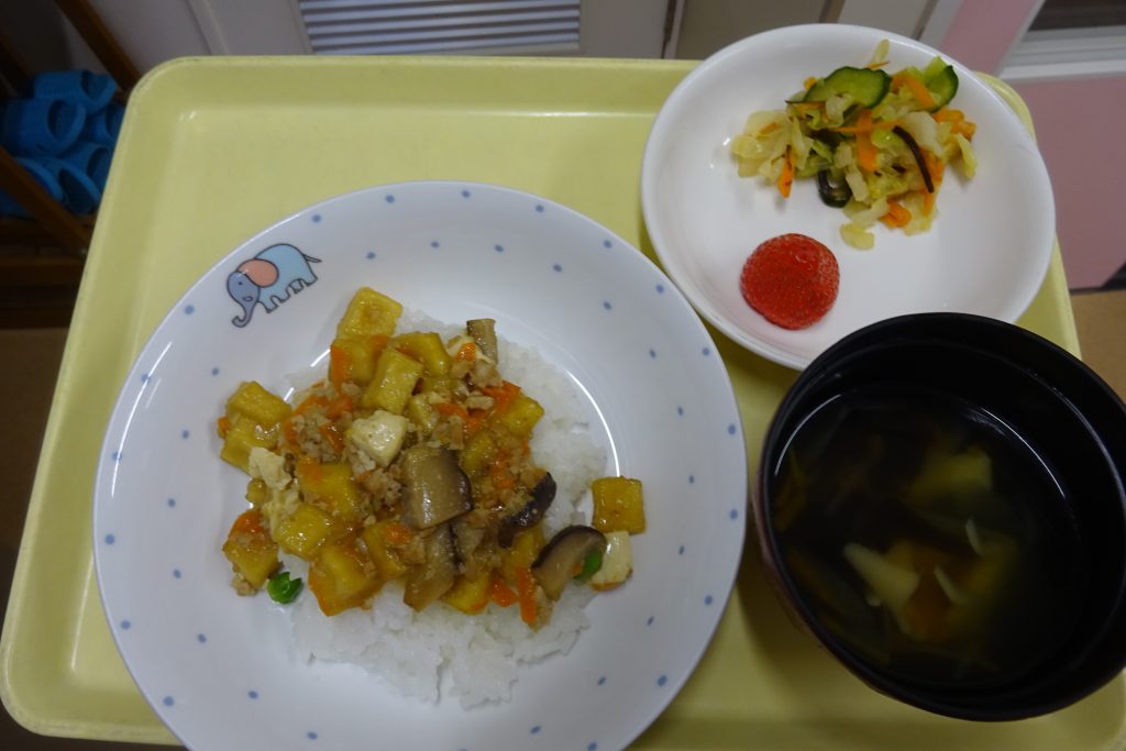かみかみ麻婆豆腐は木綿豆腐の他に揚げた高野豆腐を入れ、噛み応えを出しました