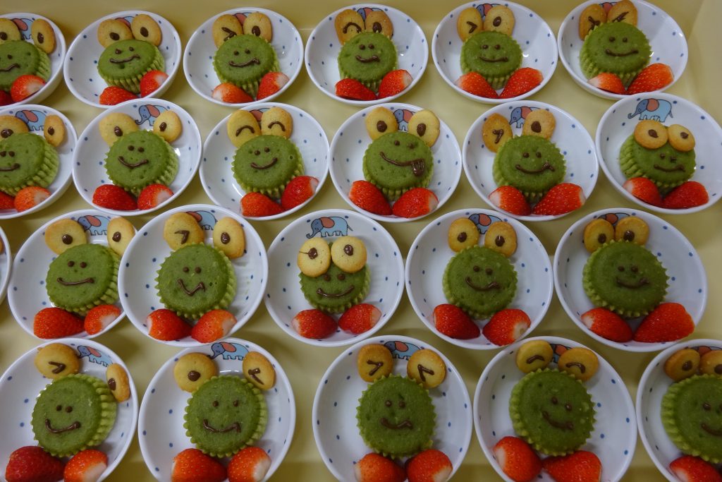 ケロケロ蒸しパンは抹茶の蒸しパンにチョコペンで口と鼻を、クッキーに目を描きカエルに