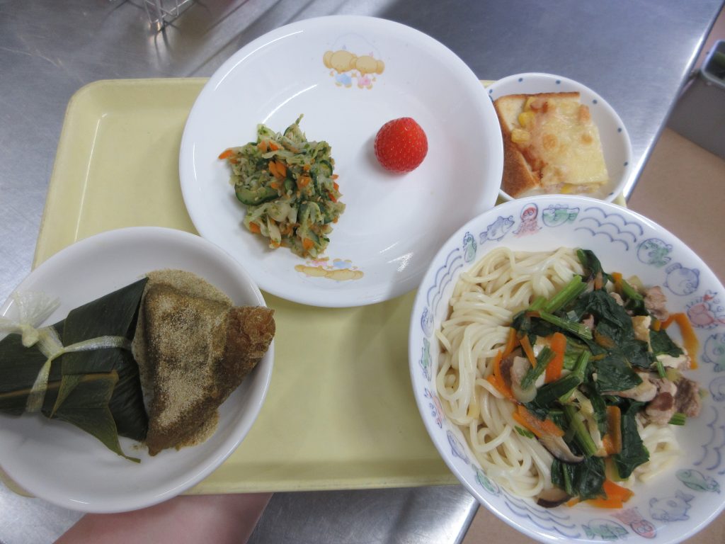 6/7(金)の給食では「笹巻き・肉うどん・磯和え・いちご」を提供しましたkira02.gif