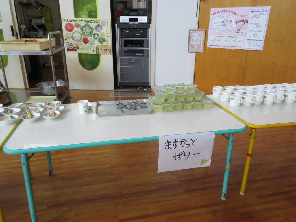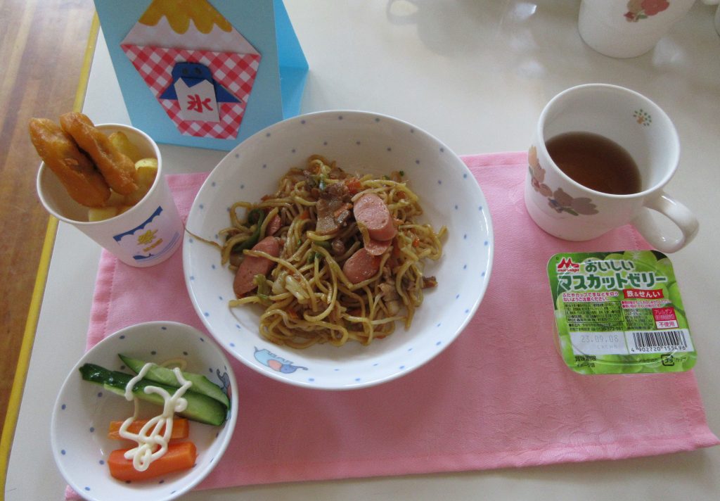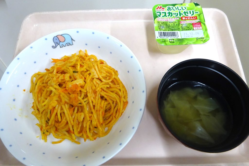 9月21日の誕生会では給食で「シーフードスパゲティー」