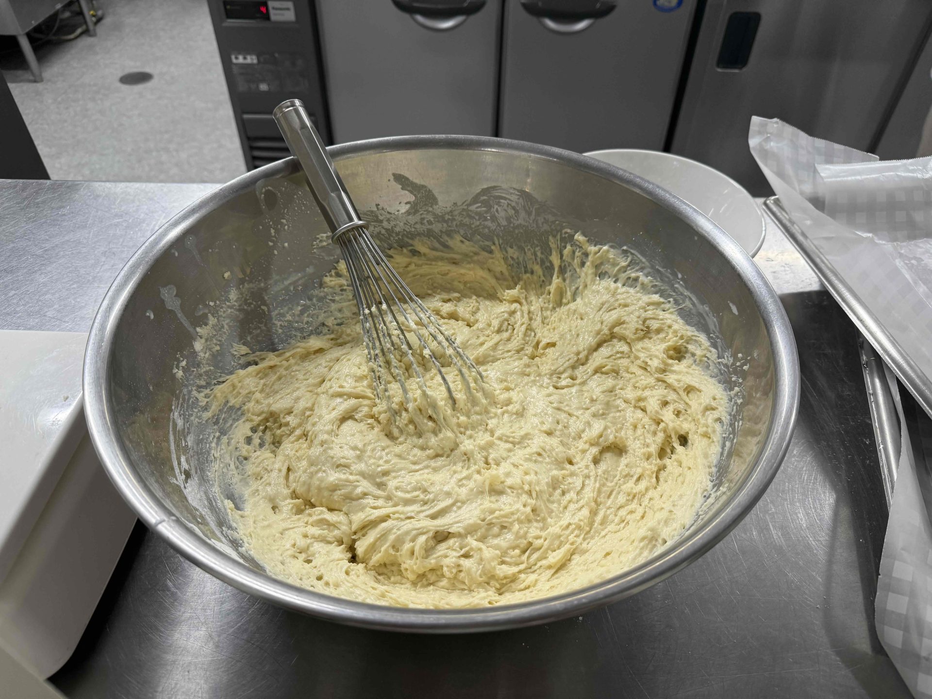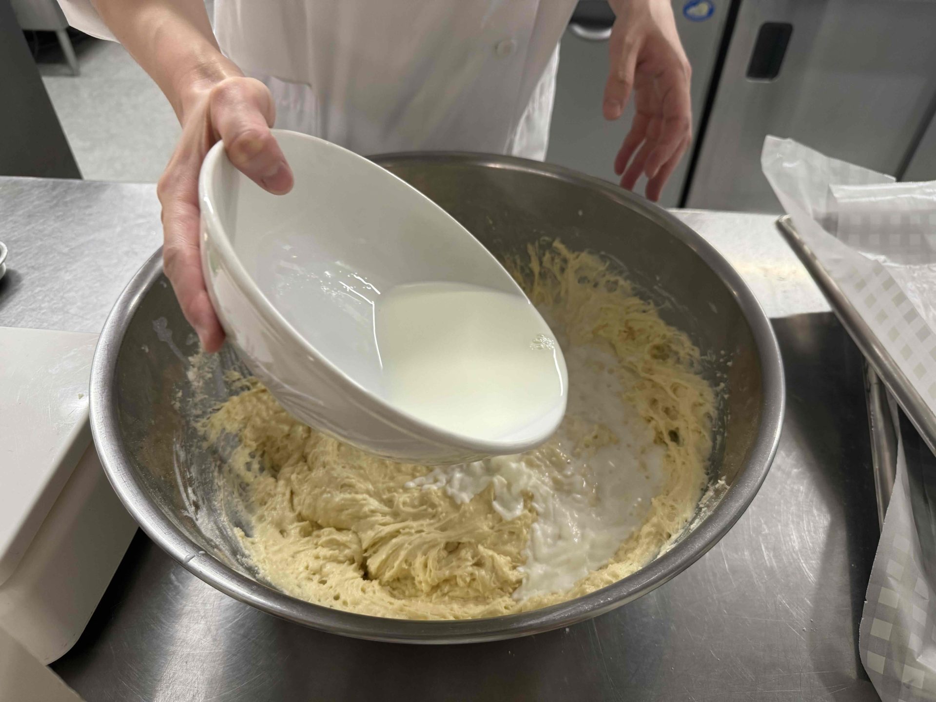 ①ホットケーキミックス、牛乳、ベーキングパウダーをよ~く混ぜ合わせます