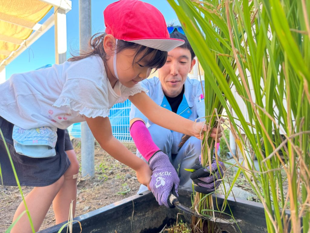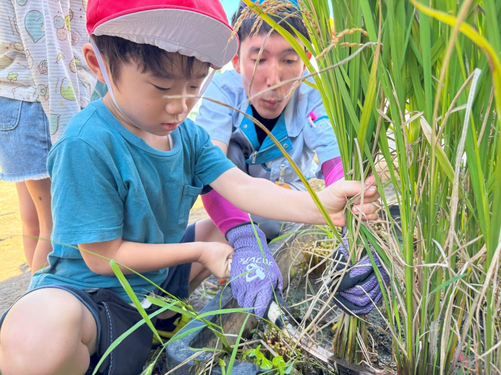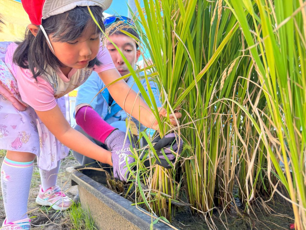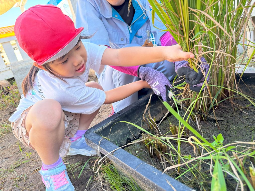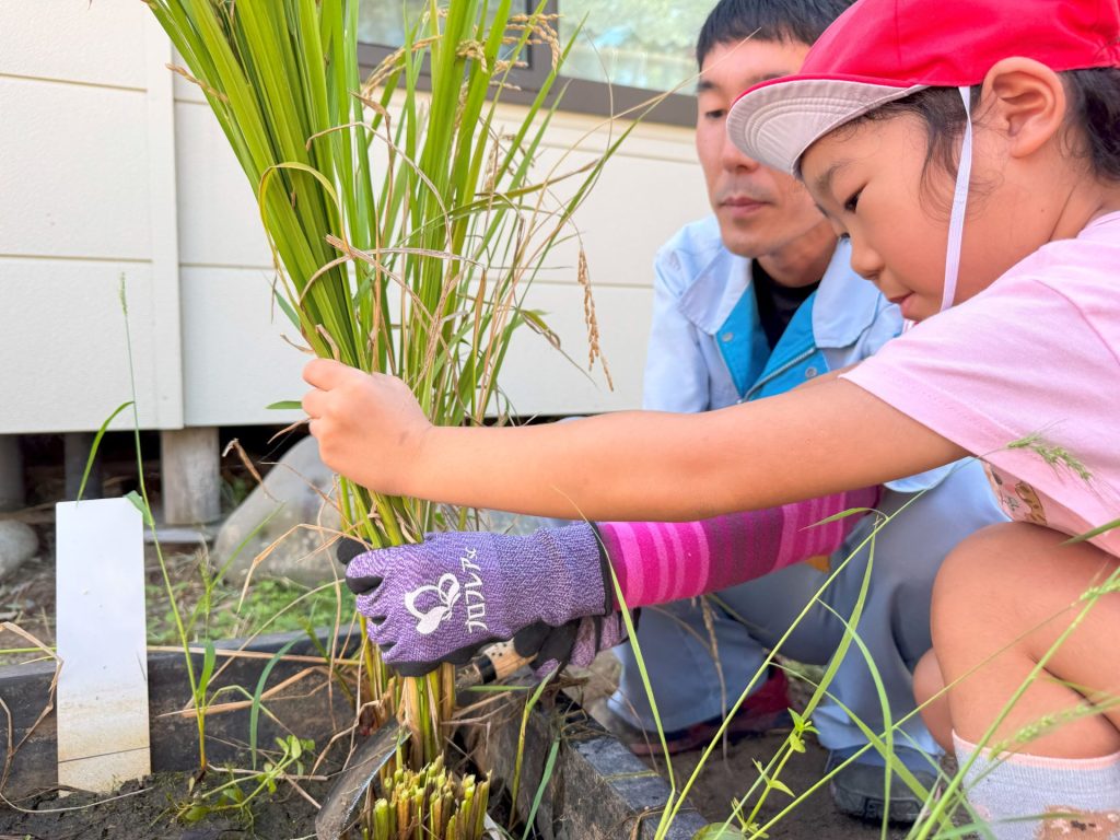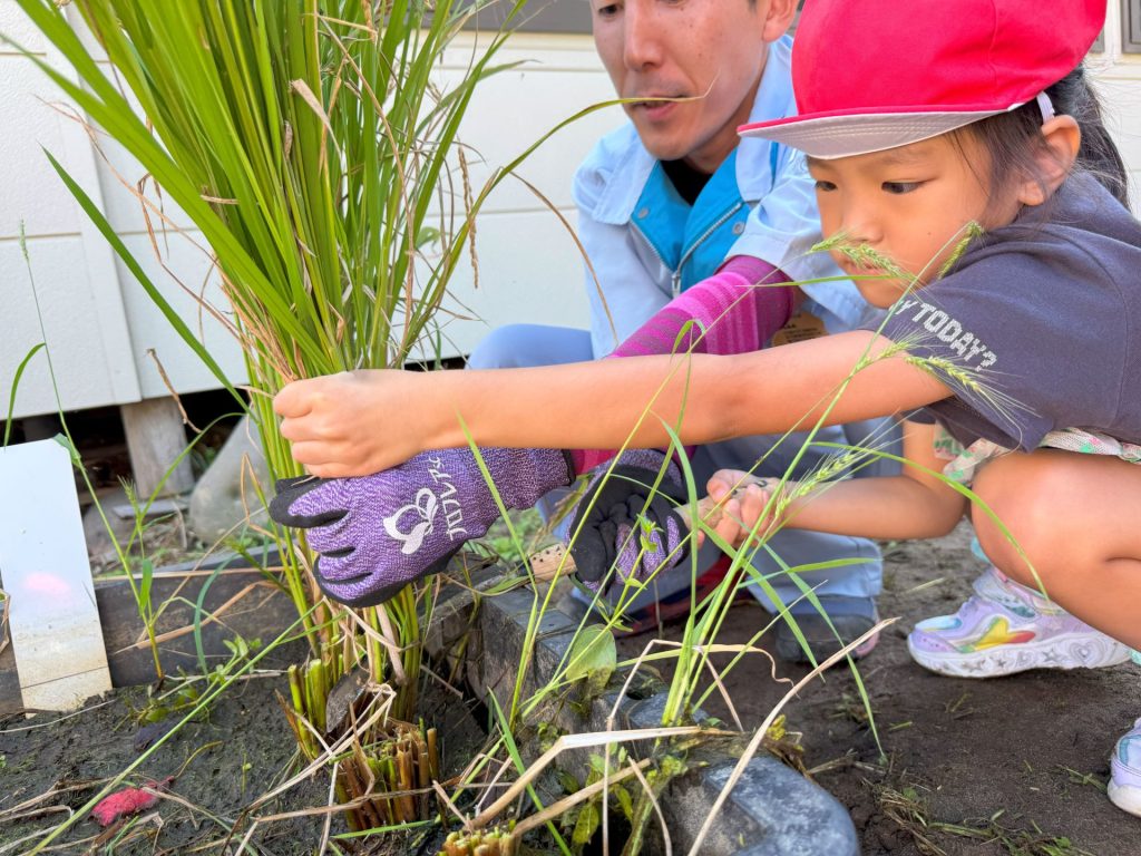 今日は5月16日の保育参観の時に植えた苗が立派に育ったので、Wちゃんのお父さんに教えていただきながら稲刈りを行いました🌾