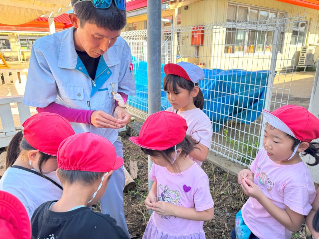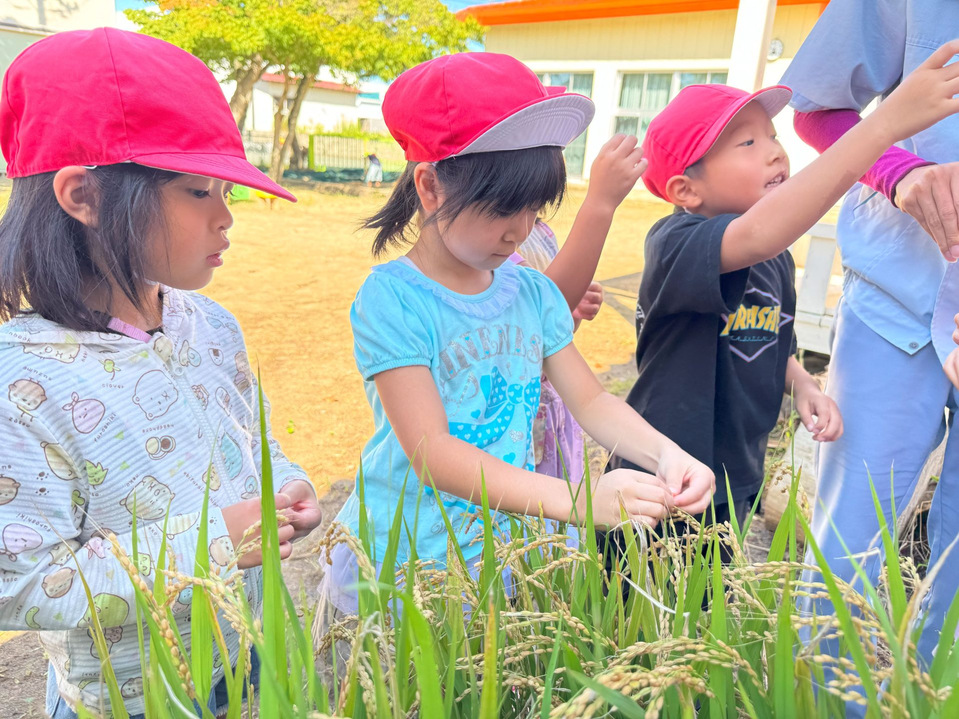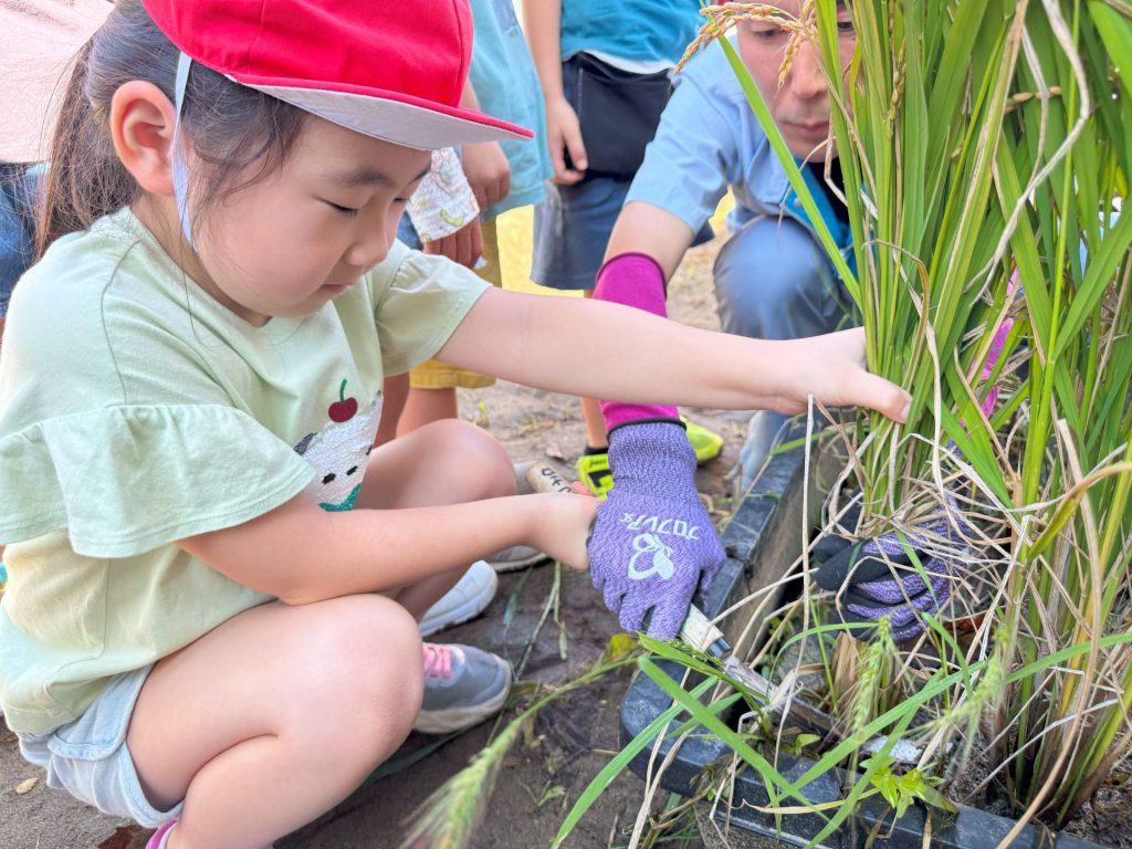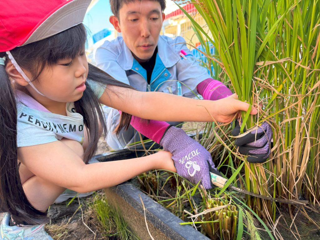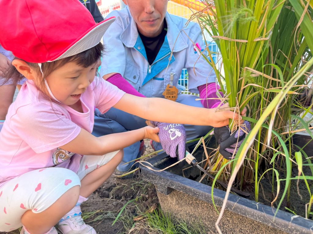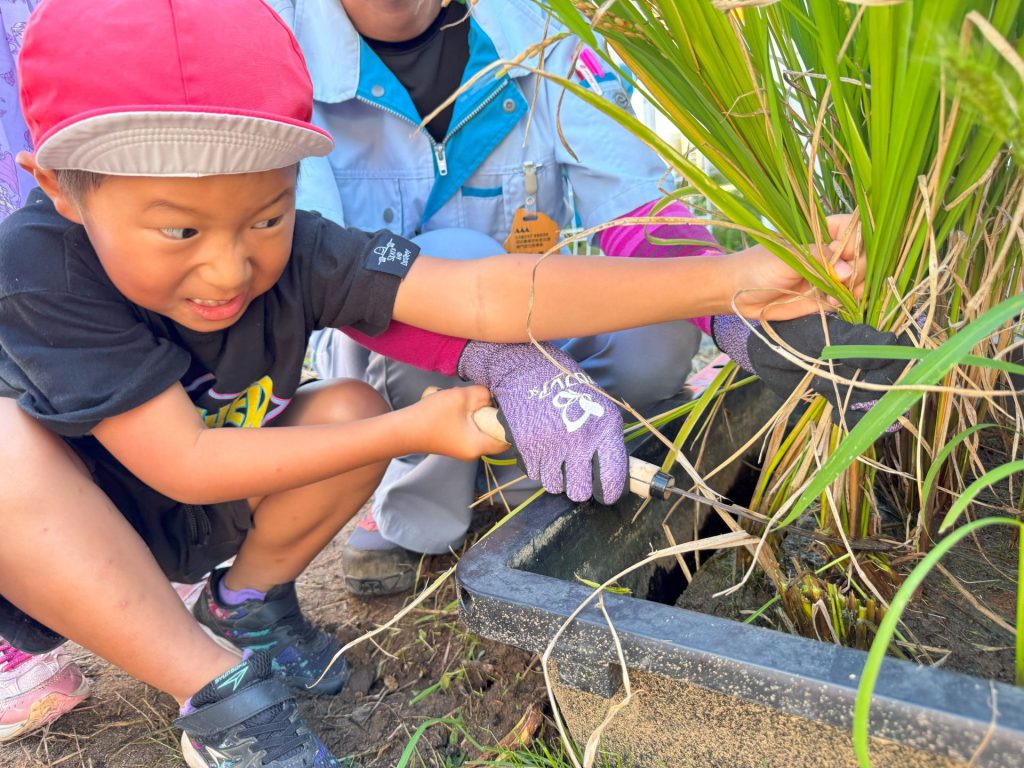 今日は5月16日の保育参観の時に植えた苗が立派に育ったので、Wちゃんのお父さんに教えていただきながら稲刈りを行いました🌾