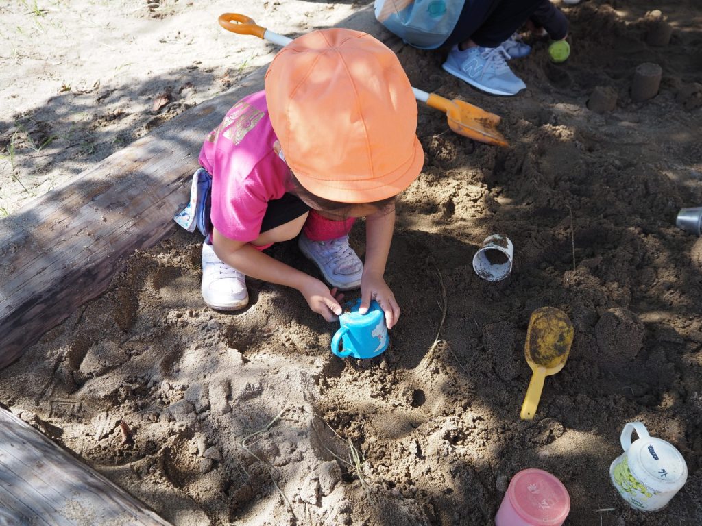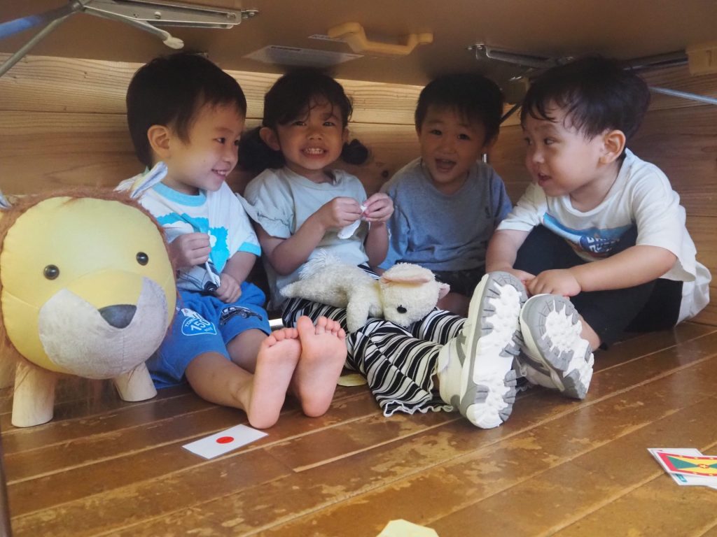 耳を澄まして探していると、ままごとコーナーのテーブルの下にいる子どもたちを発見