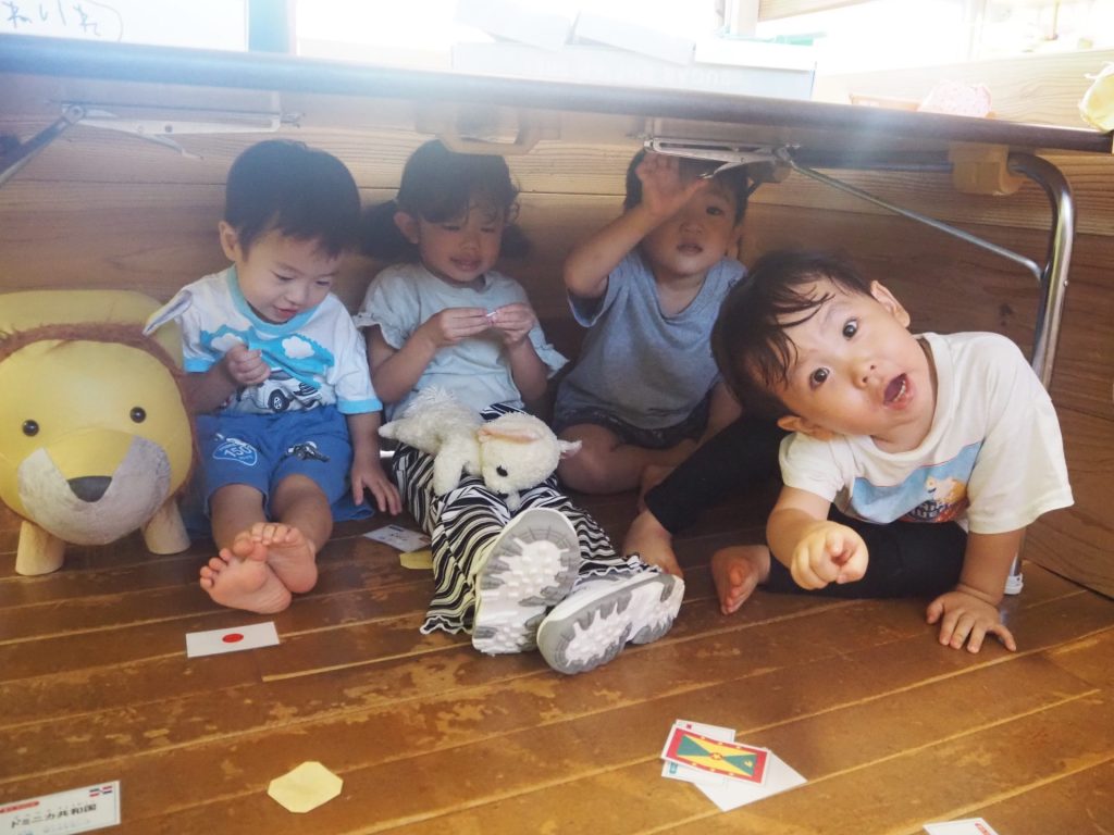 「地震だ地震だー」と自主避難訓練でテーブルの下に隠れたみたいです。