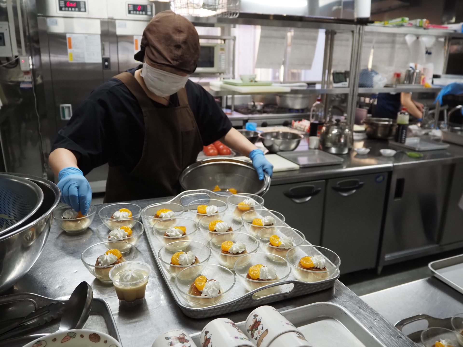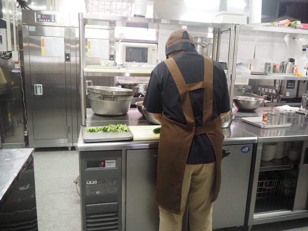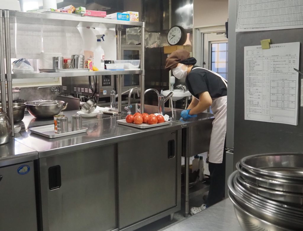 調理さん達は、早速トッピングになる野菜と格闘開始