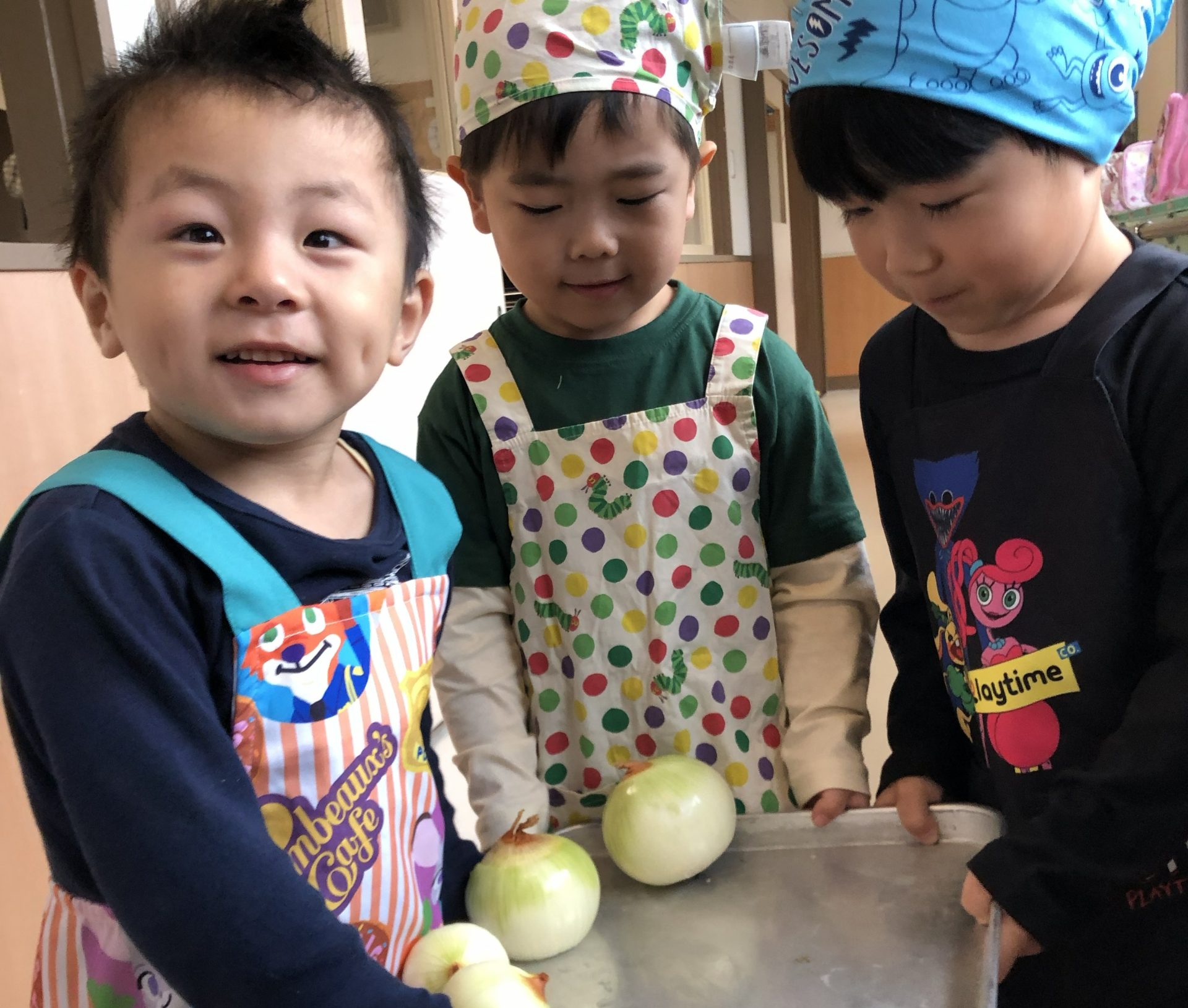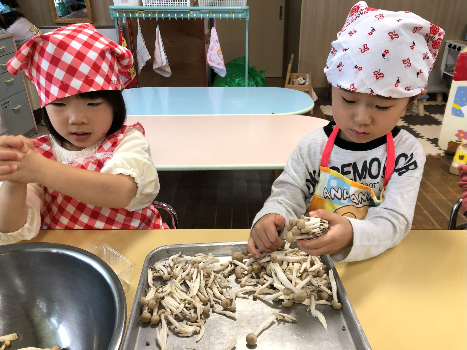 子ども達が考えたメニューは‟さつまいもカレー🍛”朝一のお米とぎから始まり、梅組さんはしめじほぐしと玉ねぎの皮むき、竹組さんはにんじんを切り、松組さんはさつまいもと玉ねぎを切りました!一生懸命心を込めて楽しみながらクッキングをしてくれました🎵