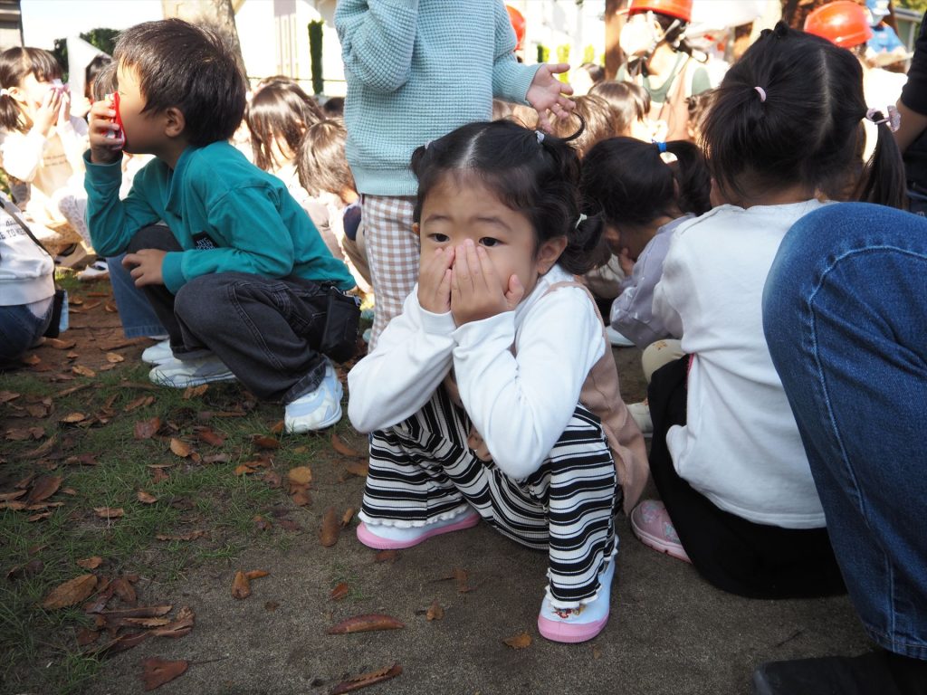 調理室から出火した想定で行いました。非常ベルと火事ぶれが聞こえると、すぐに先生の近くへ集まって園庭へ避難しました。