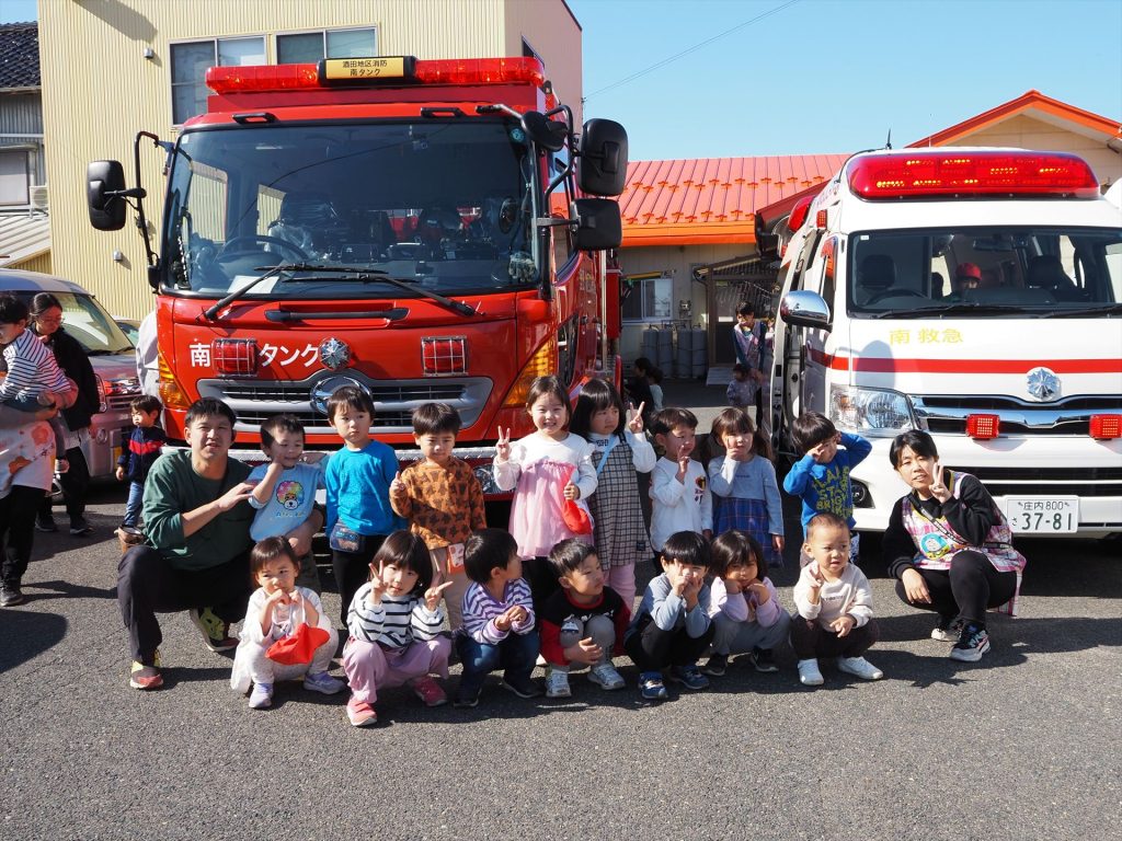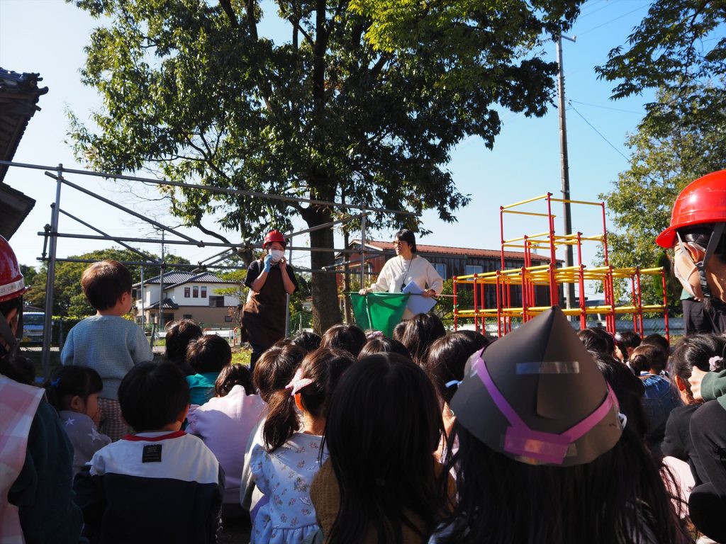 園庭へ避難すると、消防士さんからお話してもらいました。