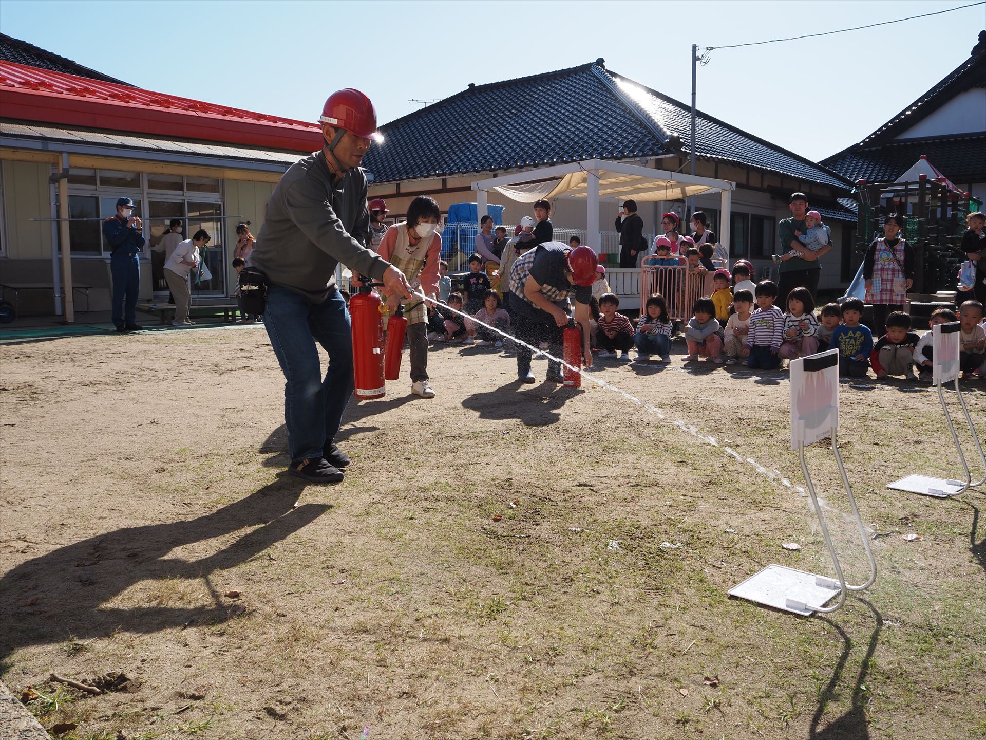 調理室から出火した想定で行いました。非常ベルと火事ぶれが聞こえると、すぐに先生の近くへ集まって園庭へ避難しました。