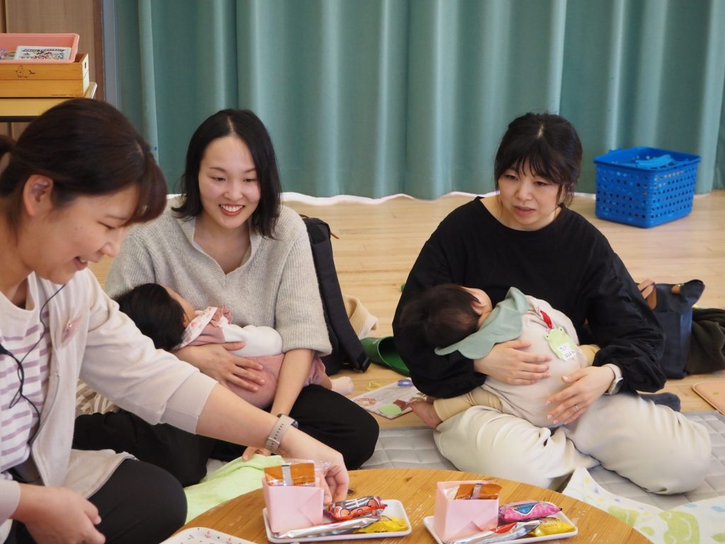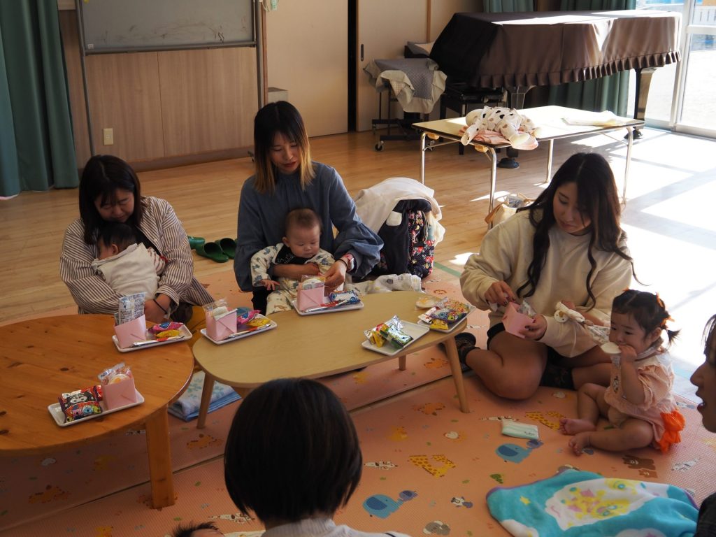 お茶やお菓子を囲んで、子育て相談や日頃どんなことをして過ごしているか等、友花先生や広野保育園の職員、お家の方同士でお話を楽しみながらの和やかな雰囲気の中のカフェタイムとなりました☕