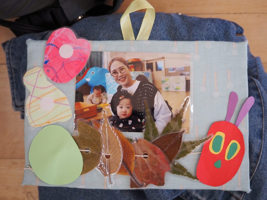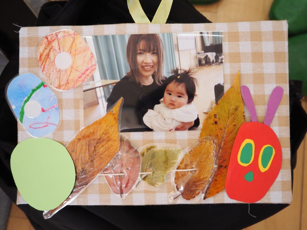 葉っぱにタコ糸を通してあおむしを作り、今日撮りたての写真を入れて完成!素敵な作品ができあがりました!