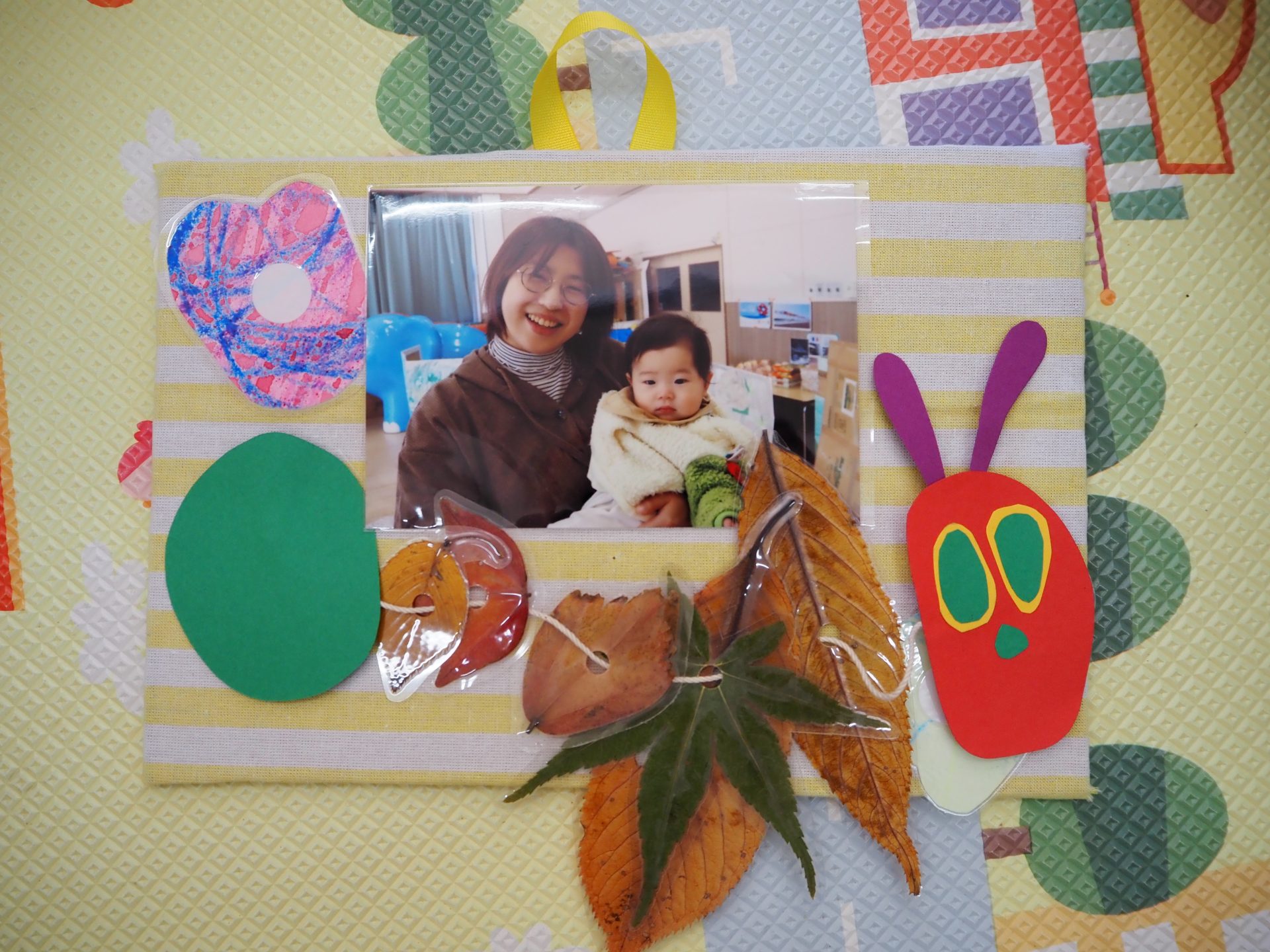 葉っぱにタコ糸を通してあおむしを作り、今日撮りたての写真を入れて完成!素敵な作品ができあがりました!