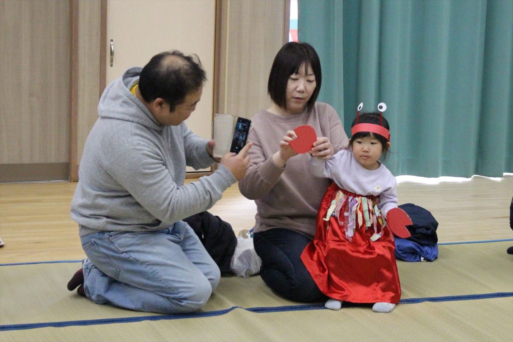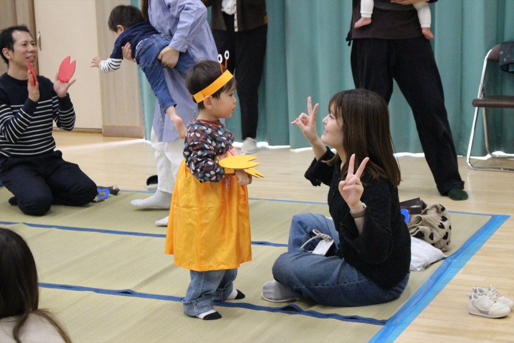 ふれあい遊びと遊戯では、お家の方々が側にいることで安心し、トンボになりきり楽しんで飛び回ったり、エビカニに変身して元気に踊ったりしてくれました。
