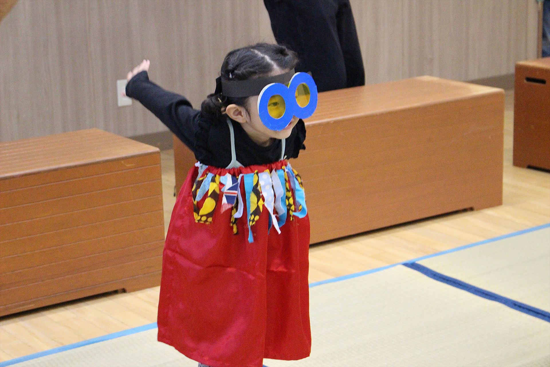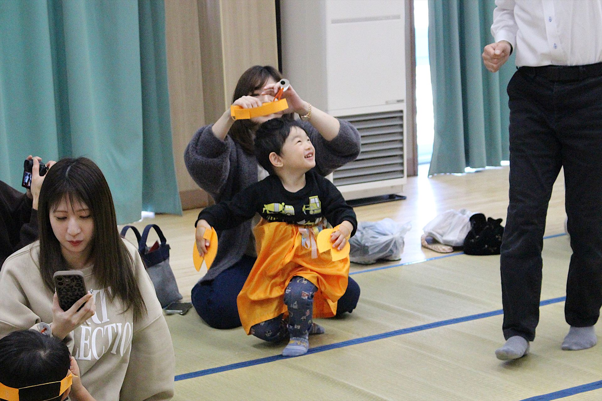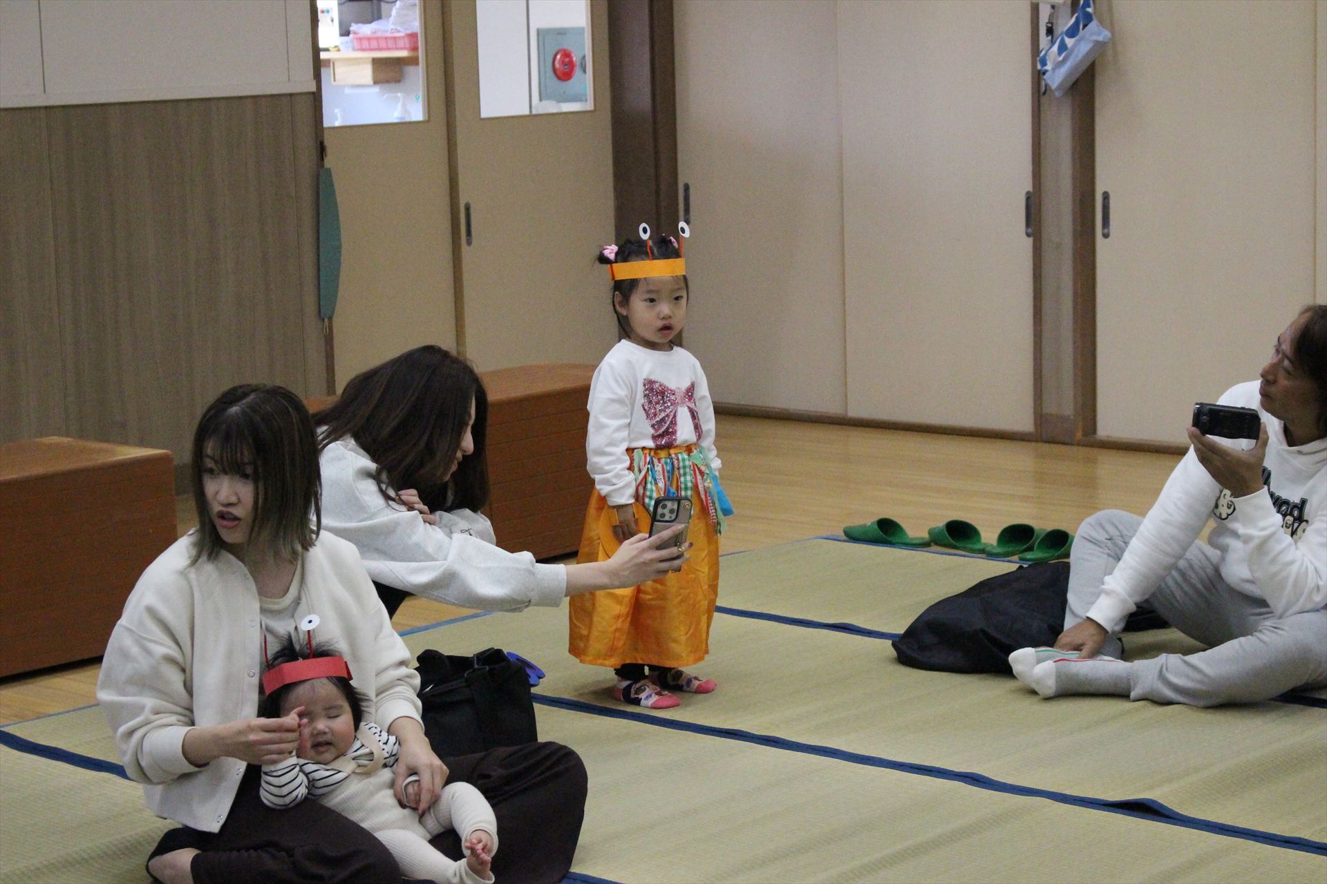 ふれあい遊びと遊戯では、お家の方々が側にいることで安心し、トンボになりきり楽しんで飛び回ったり、エビカニに変身して元気に踊ったりしてくれました。