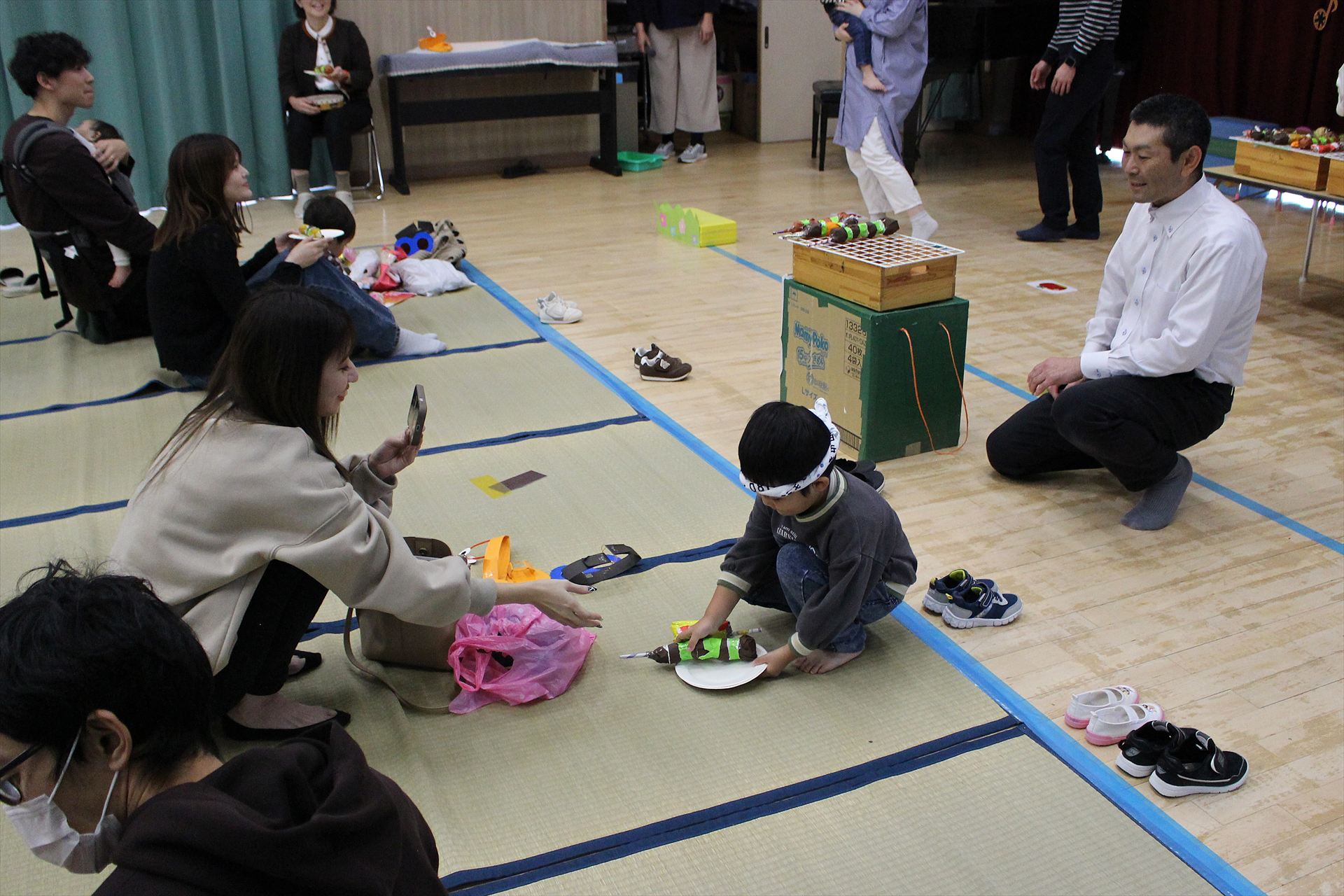 最後は子ども達の大好きな、焼き鳥屋さんごっこの開店です。「いらっしゃませ~」「焼き鳥いりませんか~」とお家の方へ焼き鳥を渡してくれていました。