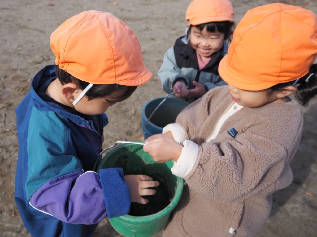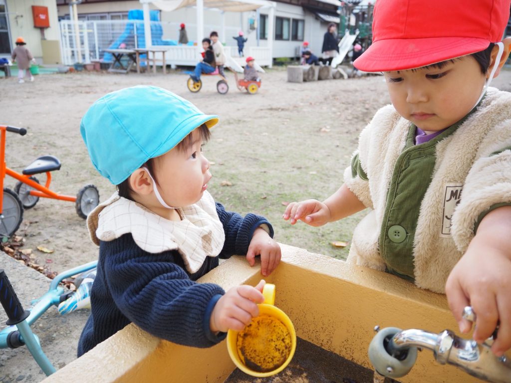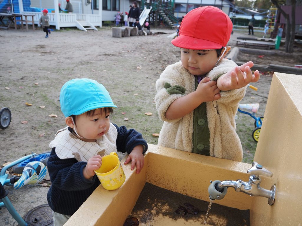 園庭では、ひよこ組さんの鼻水に気づいた桃組さんが、梅組のお姉さんから貰ったティッシュで鼻水を拭いてくれていました😊💕