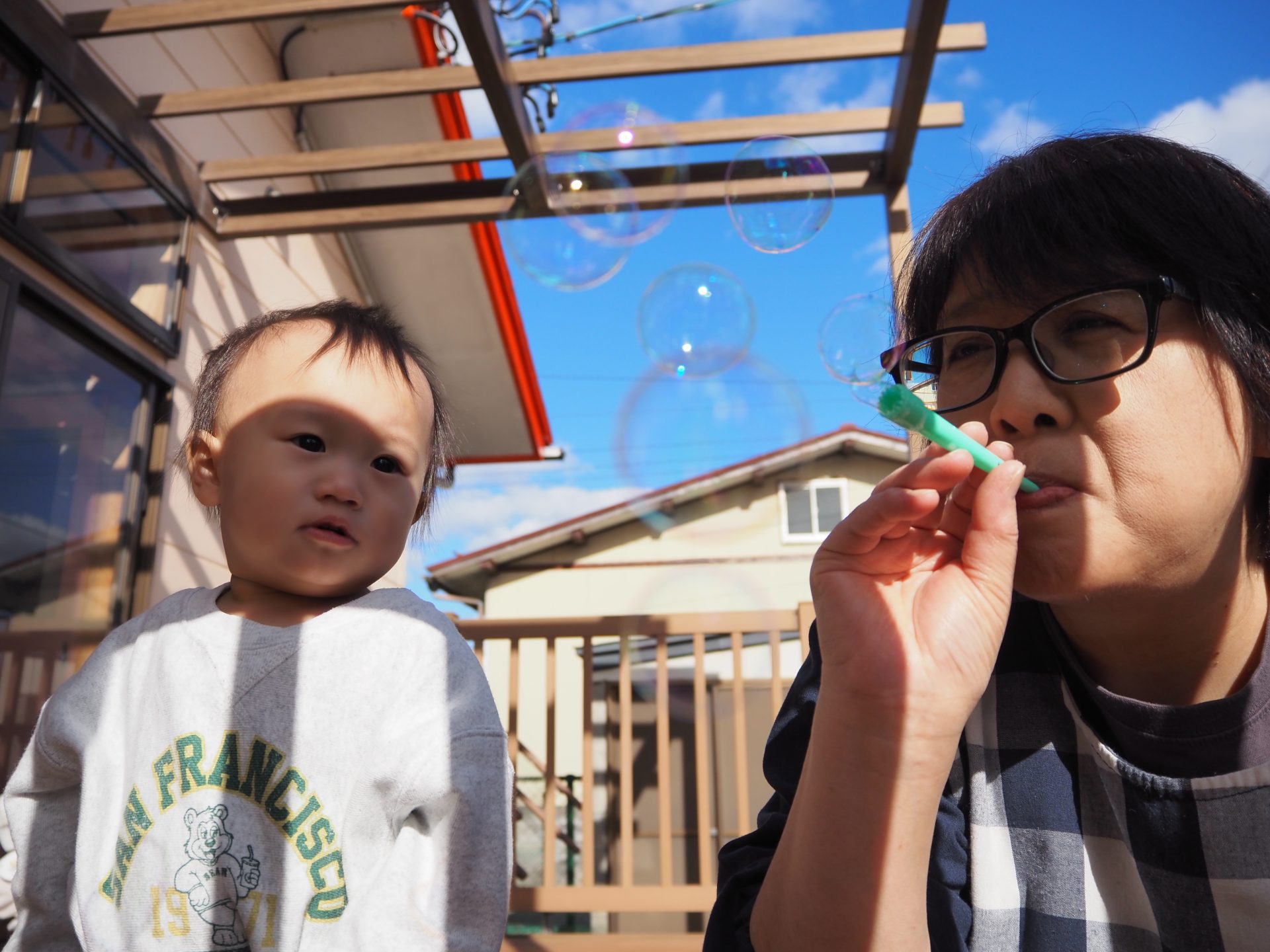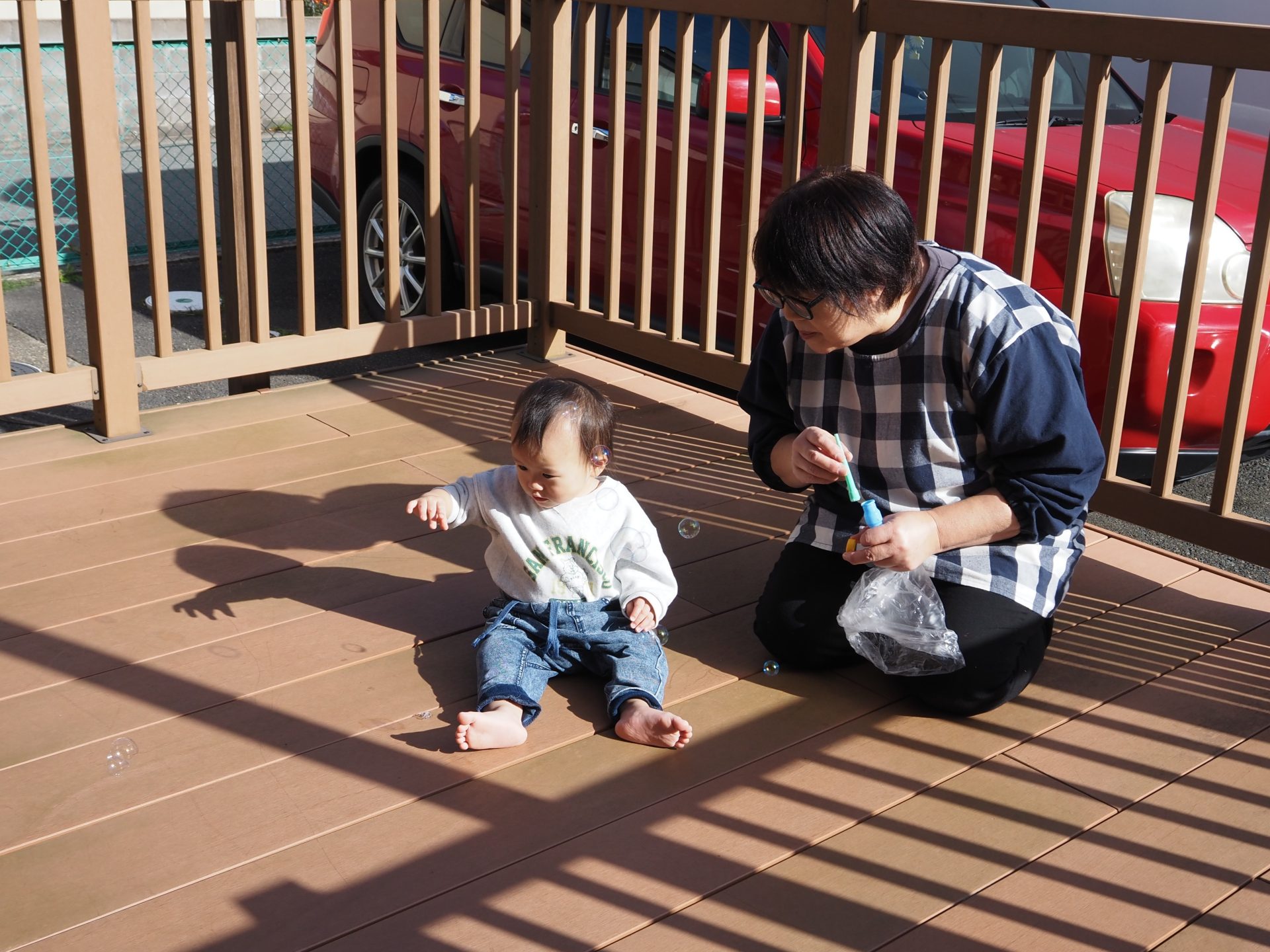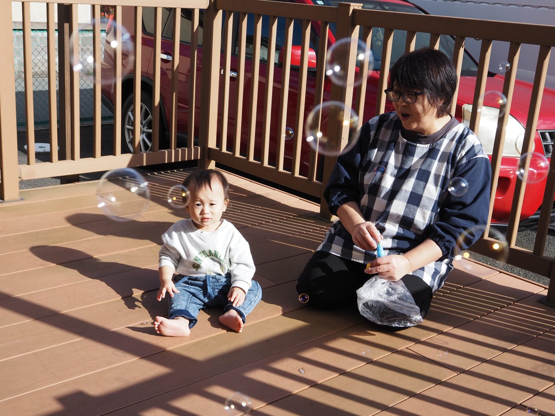 ひよこ組のテラスではシャボン玉で遊ぶRくんとK先生の姿が。 Rくんは初めて見るシャボン玉を不思議そうな表情で見つめています。