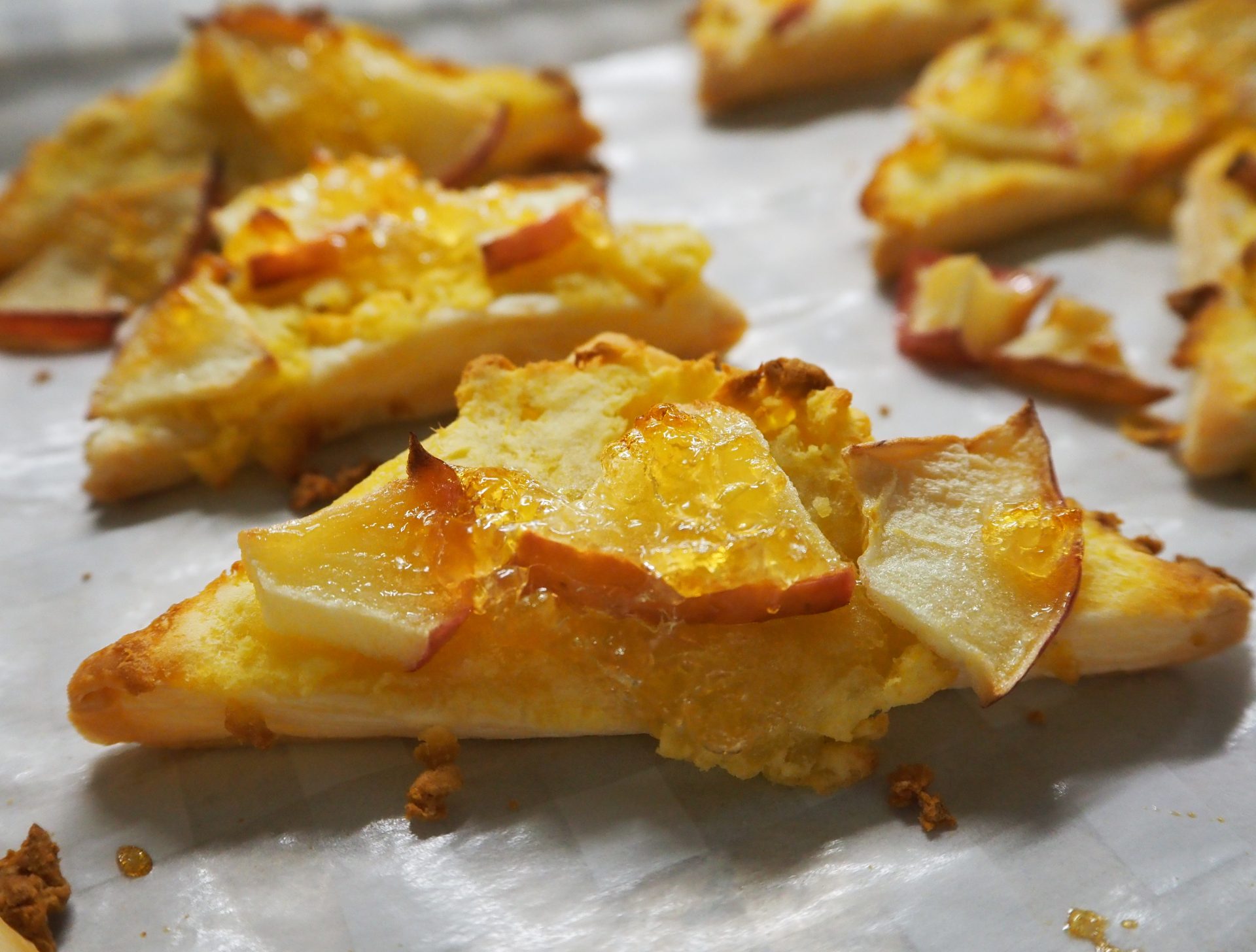 パイ生地の上にさつまいものペーストと生のリンゴをのせ、その上にりんごジャムをかけて焼き上げた一品です🍎