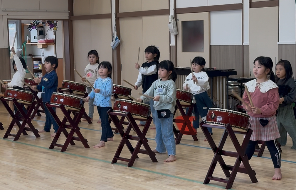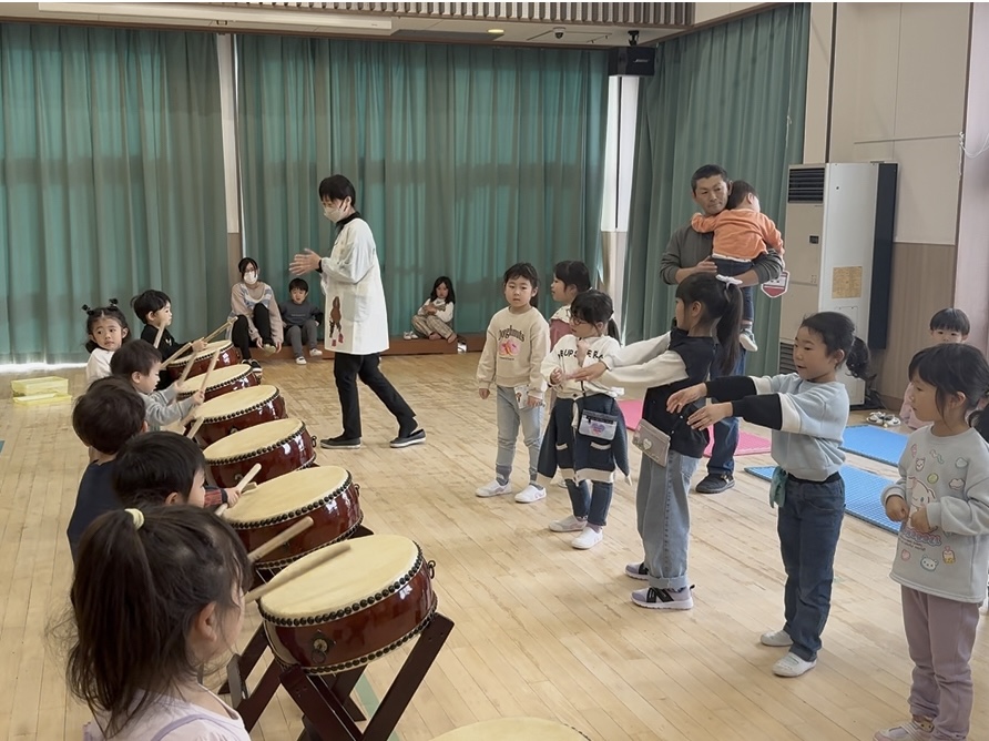 かっこいい松組さんの太鼓を見た後は、みんなで太鼓に挑戦♪