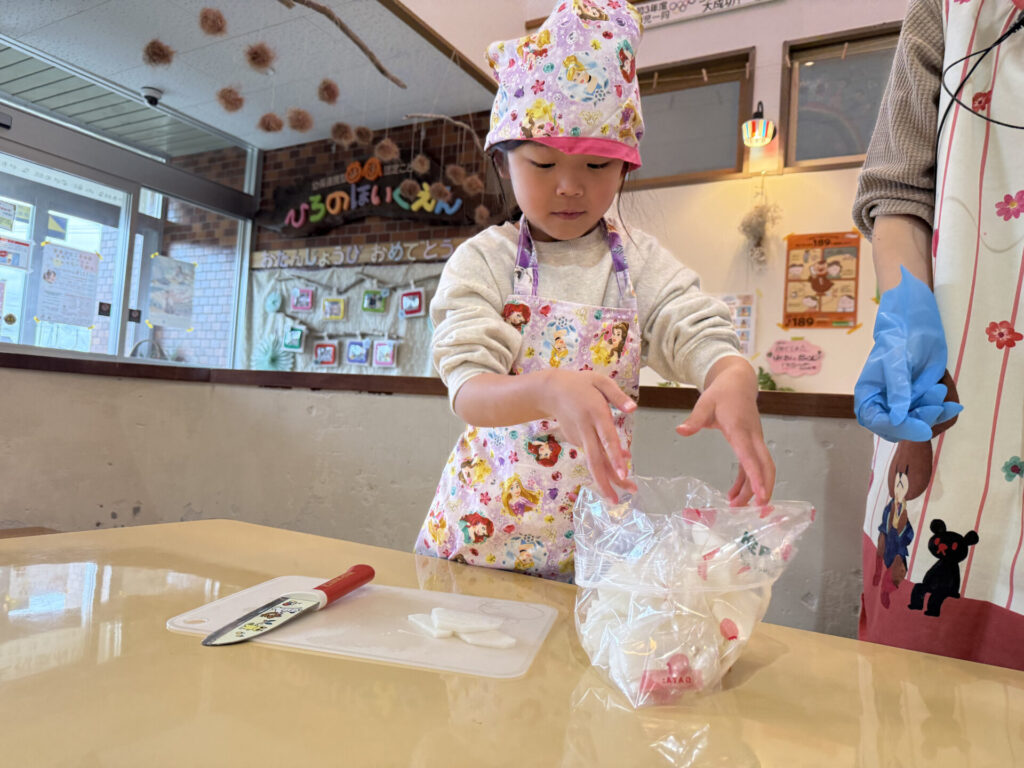 ④調味料を入れた袋の口をしっかり閉じ、もみもみします![]()