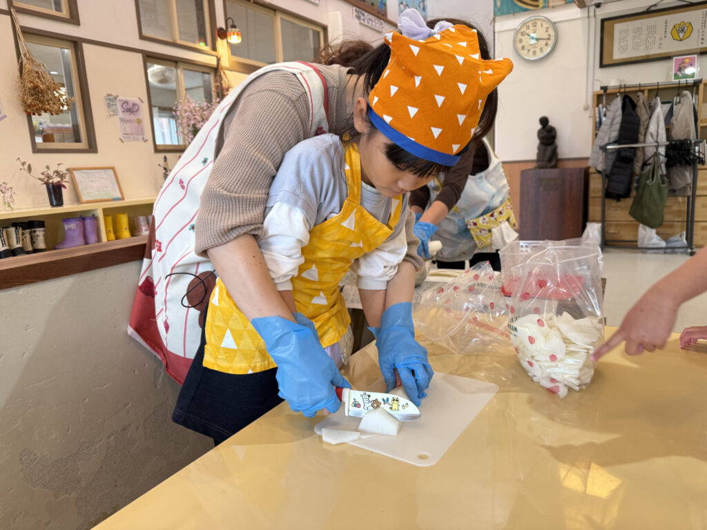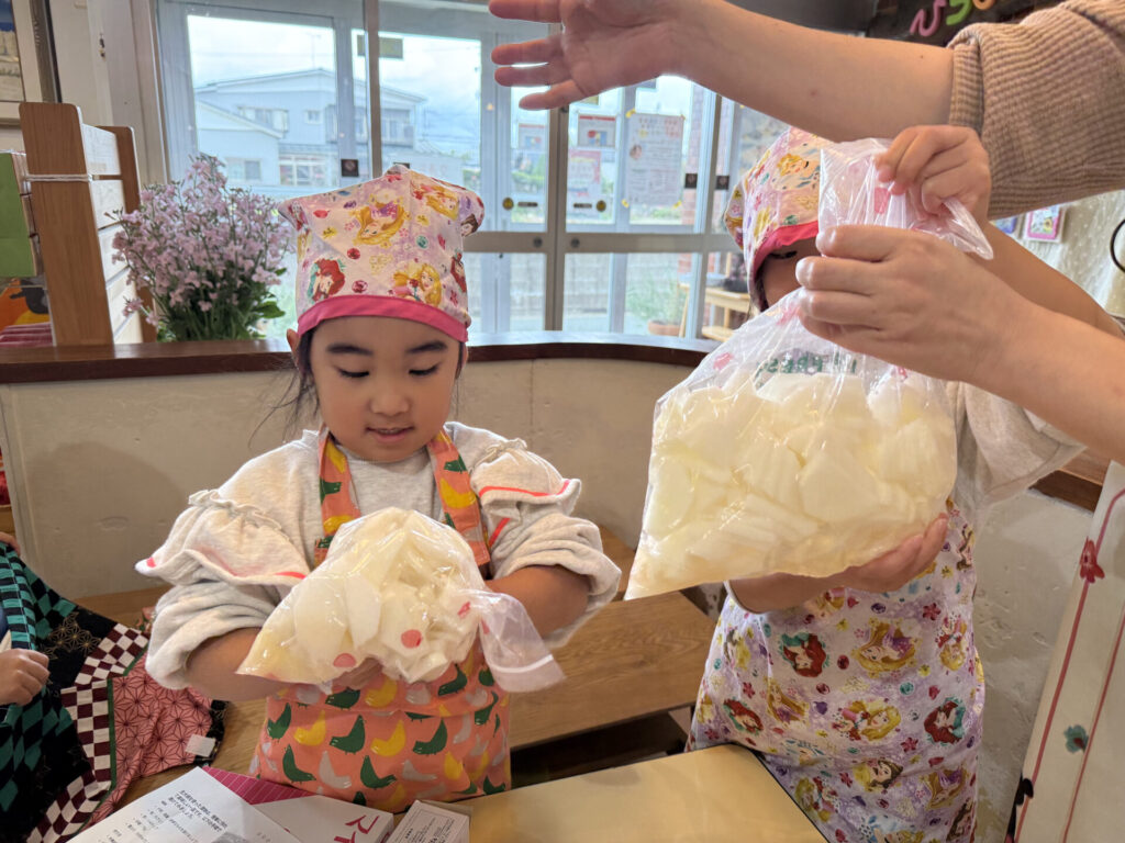 ①大根の皮をむいて縦半分に切り、さらに半月切りにしていきます。早速竹組のOちゃんがお手伝いに来てくれました!