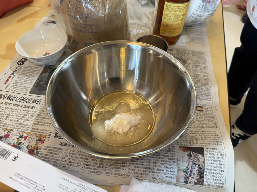 ②調味料の量を決めるため、切った大根の重さを計ります。